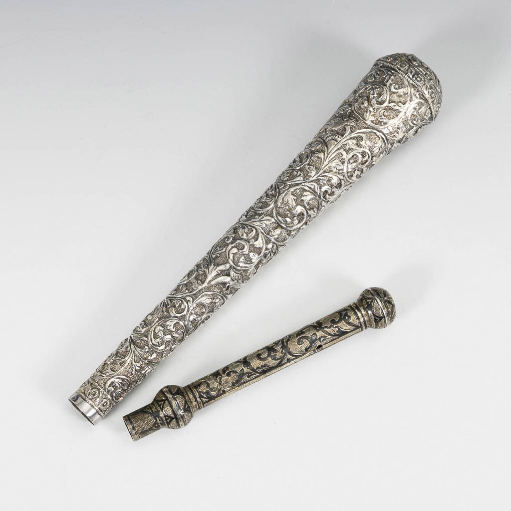 Large stick handle in relief with rocailles and birds (L 23 cm). Small, probably Russian handle decorated in niello technique (L 13 cm), with 2 subsequent holes.
