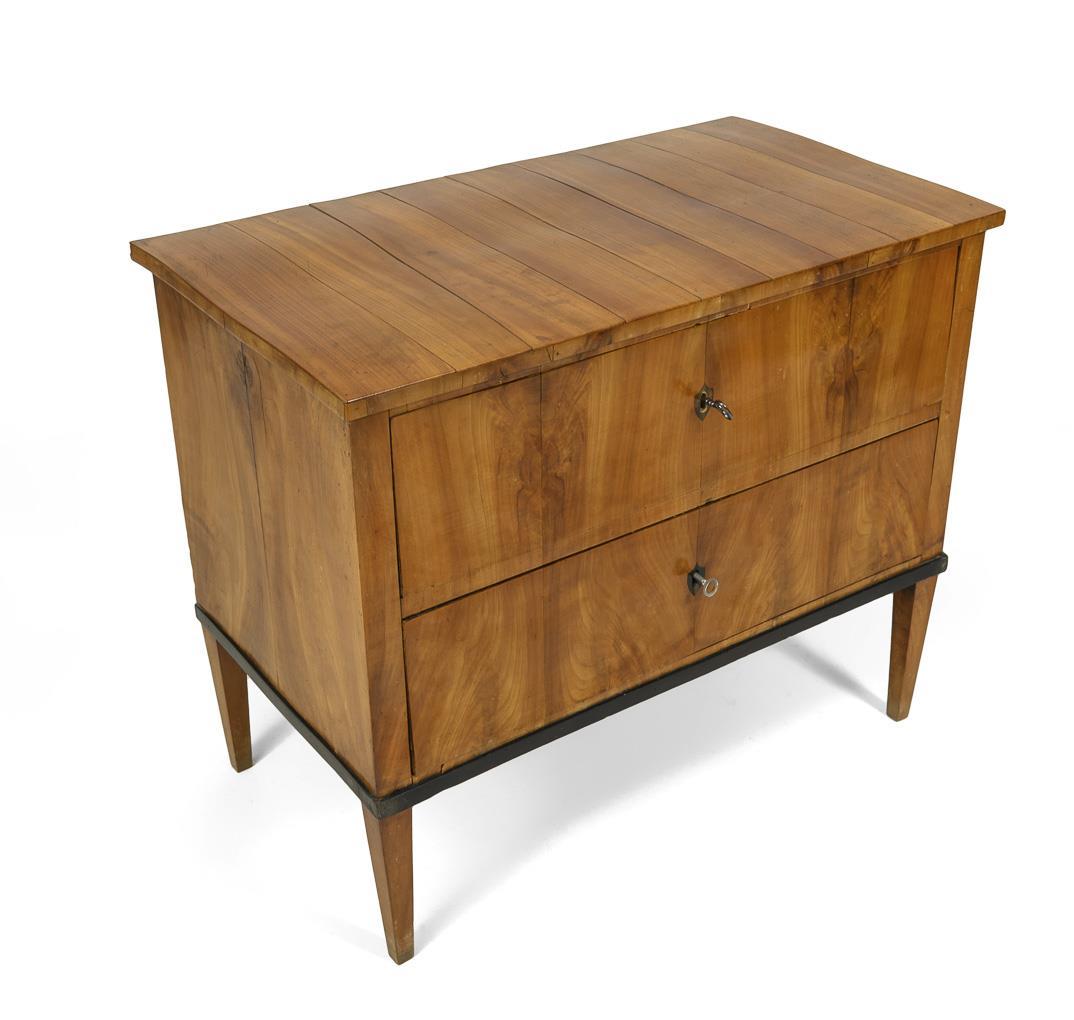 2-bay chest of drawers on pillar legs; decorated with mirrored burl veneer. In need of restoration.
