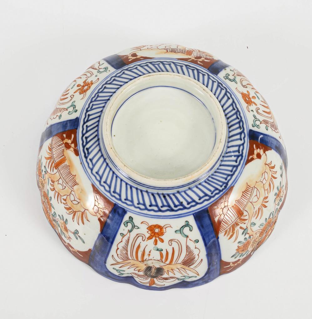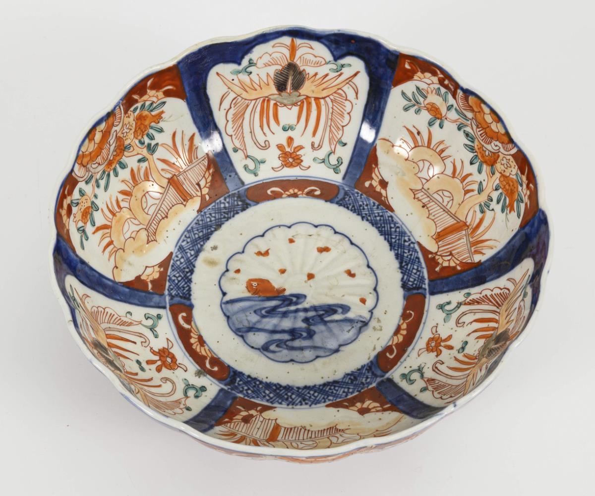 Ribbed and wavy rim. Goldfish swimming in the mirror, six-part wall with stylized phoenix and plants. So also on the outside.