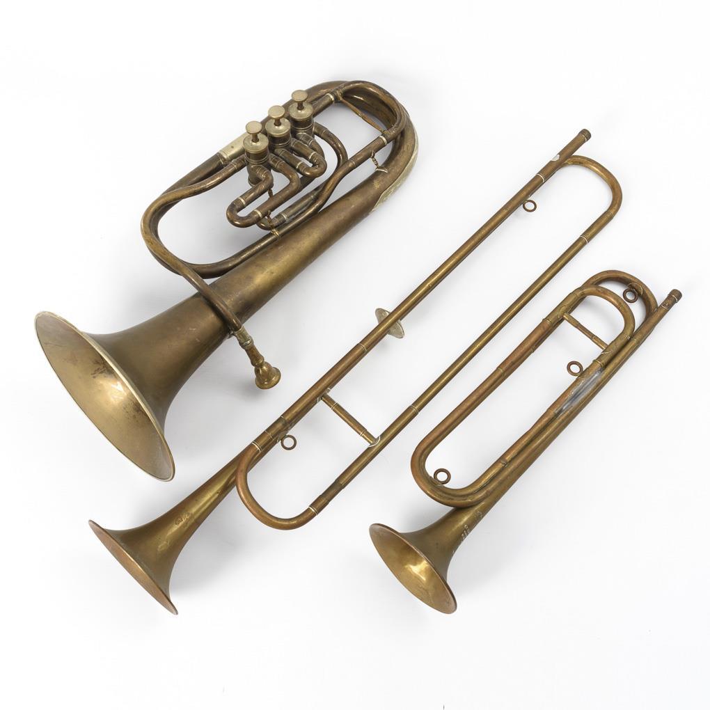 Small tuba with 3 valves, 2 fanfares, 1 of which is marked. Each in need of restoration, 2 mouthpieces missing.