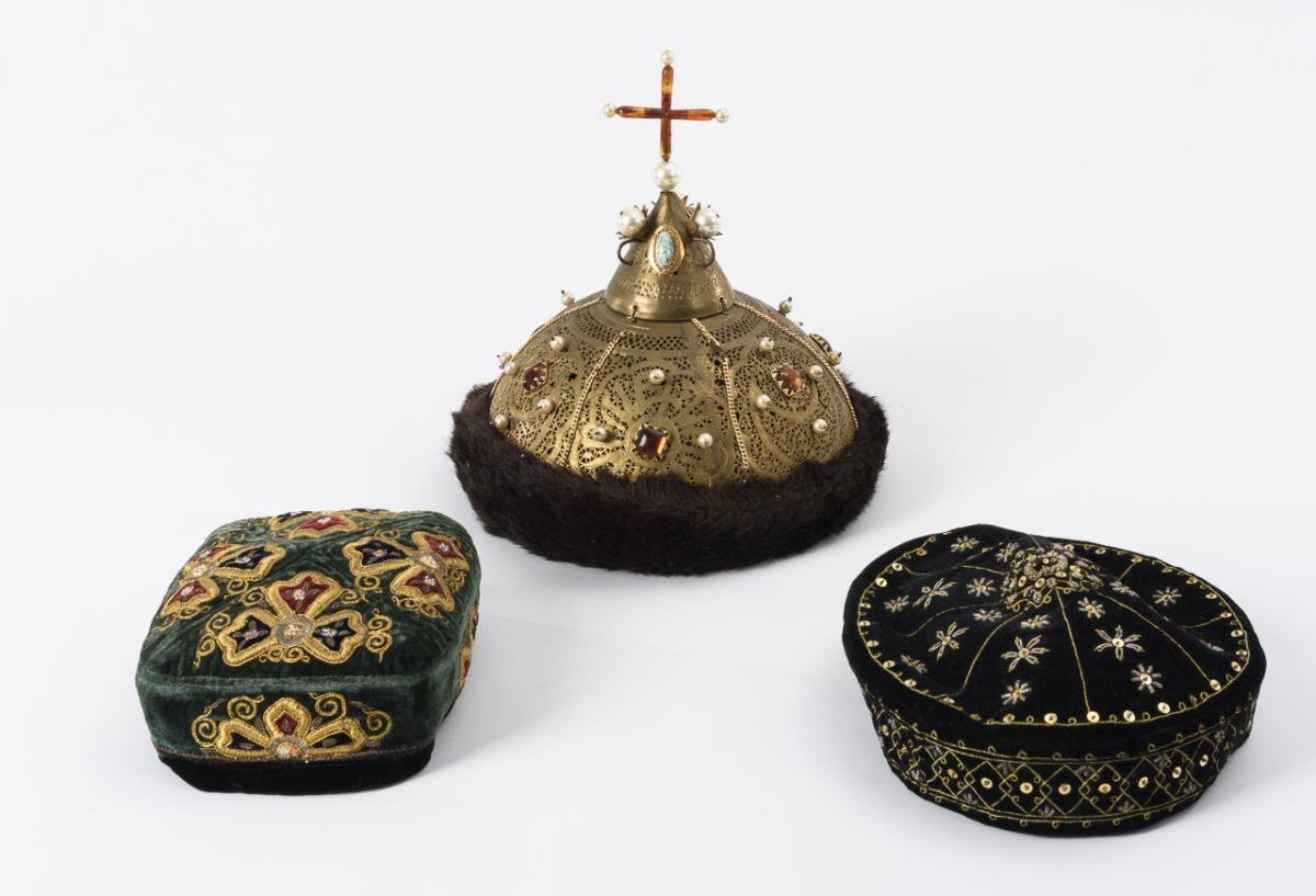 Professionally sewn velvet vest with Lahn woven borders and small mirrors. Includes inside and outside pockets. / Black velvet cap with cannetillezier and sequins. / Square quilted green velvet cap with elaborate gold embroidery. / In addition, "Tsar's crown" as a modern imitation with faux fur and style matching bag with beads and mirrors, also younger.