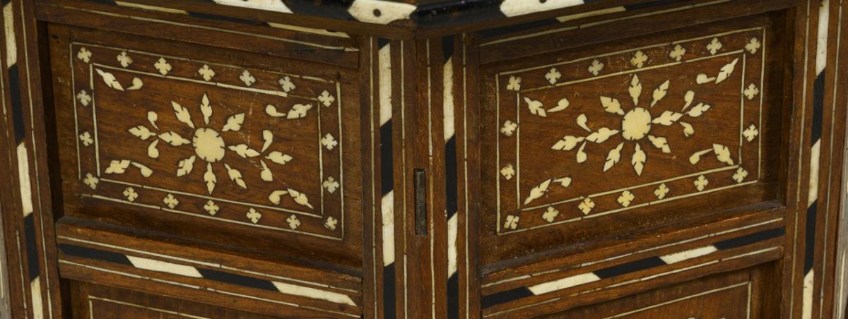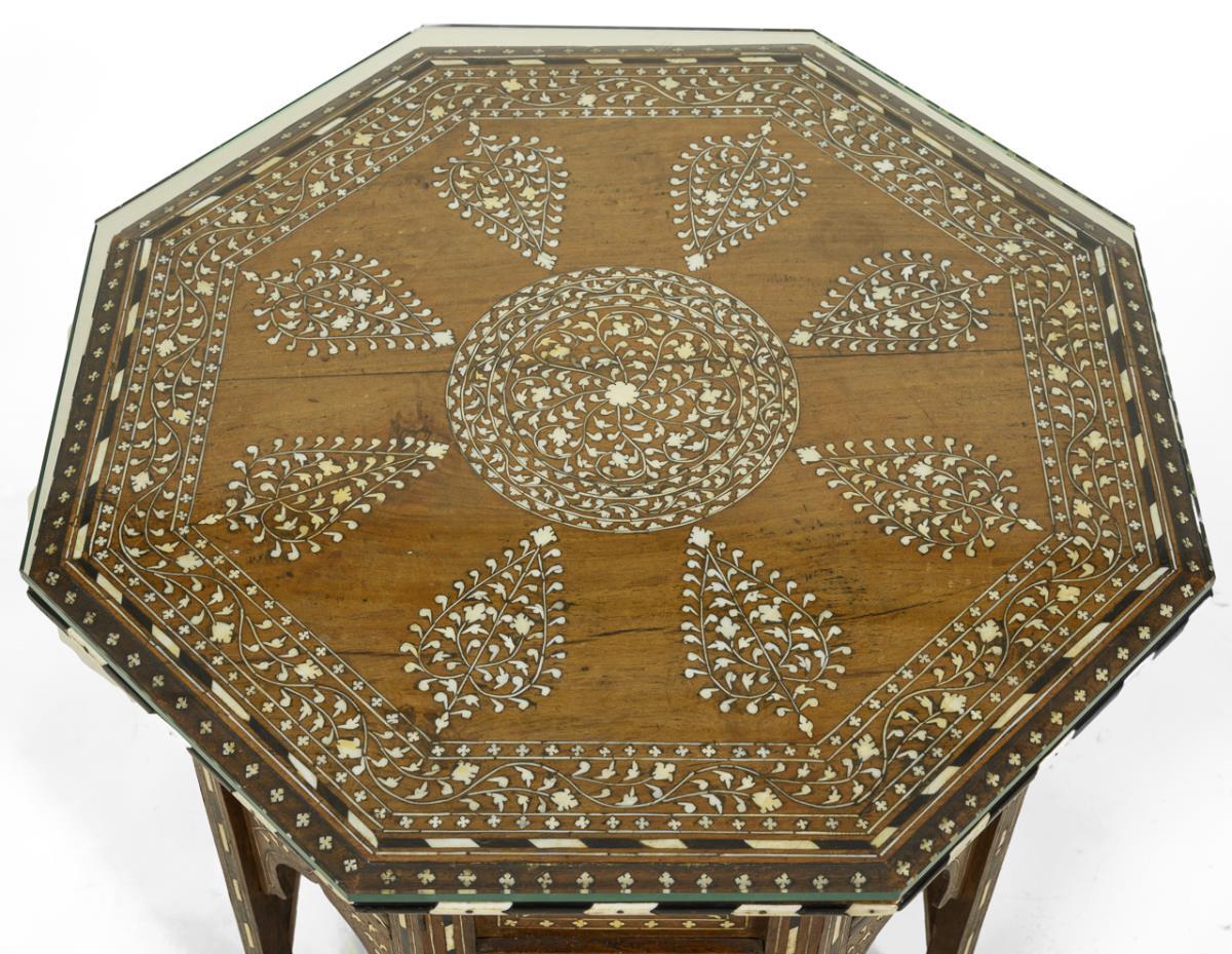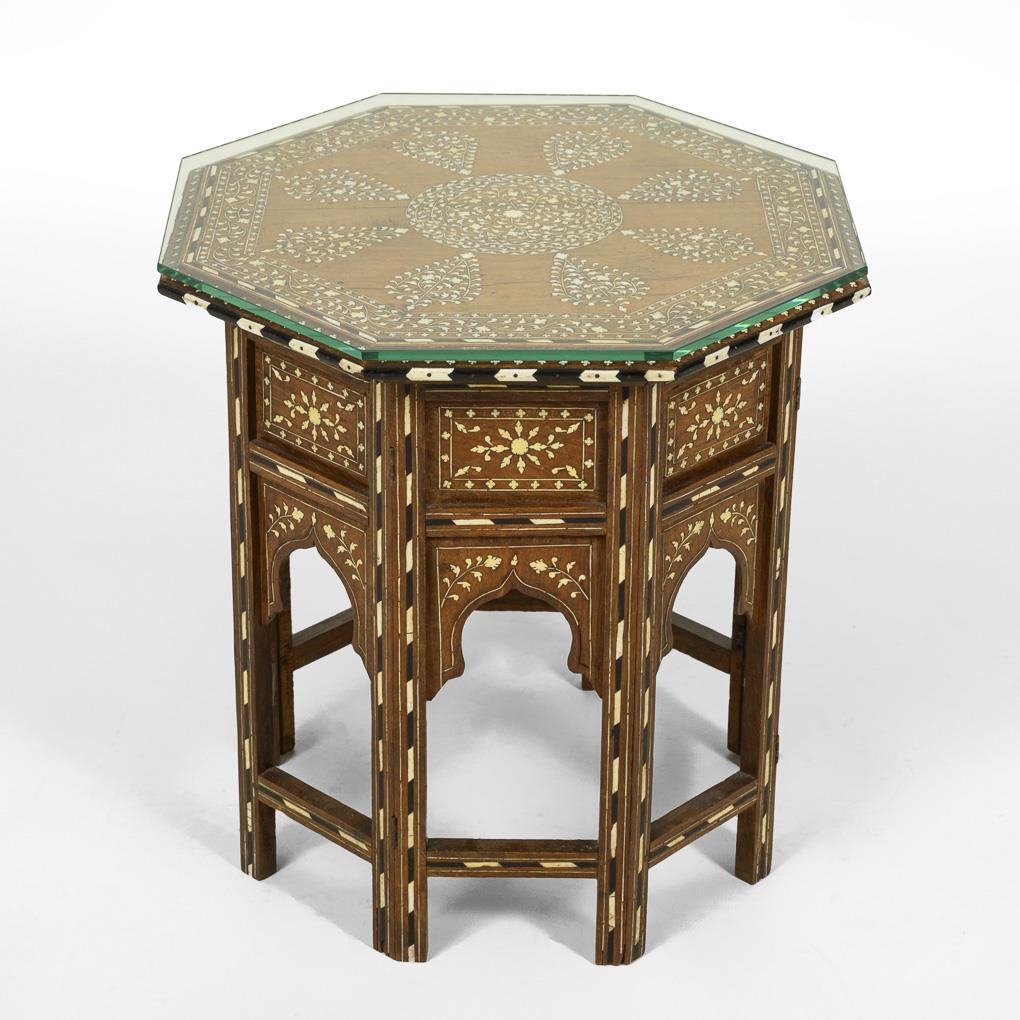 Richly decorated octagonal tea table with vegetal leg inlays in North African-Arabic style with folding frame and removable table top, plus octagonal glass top. Restored, dry cracks.