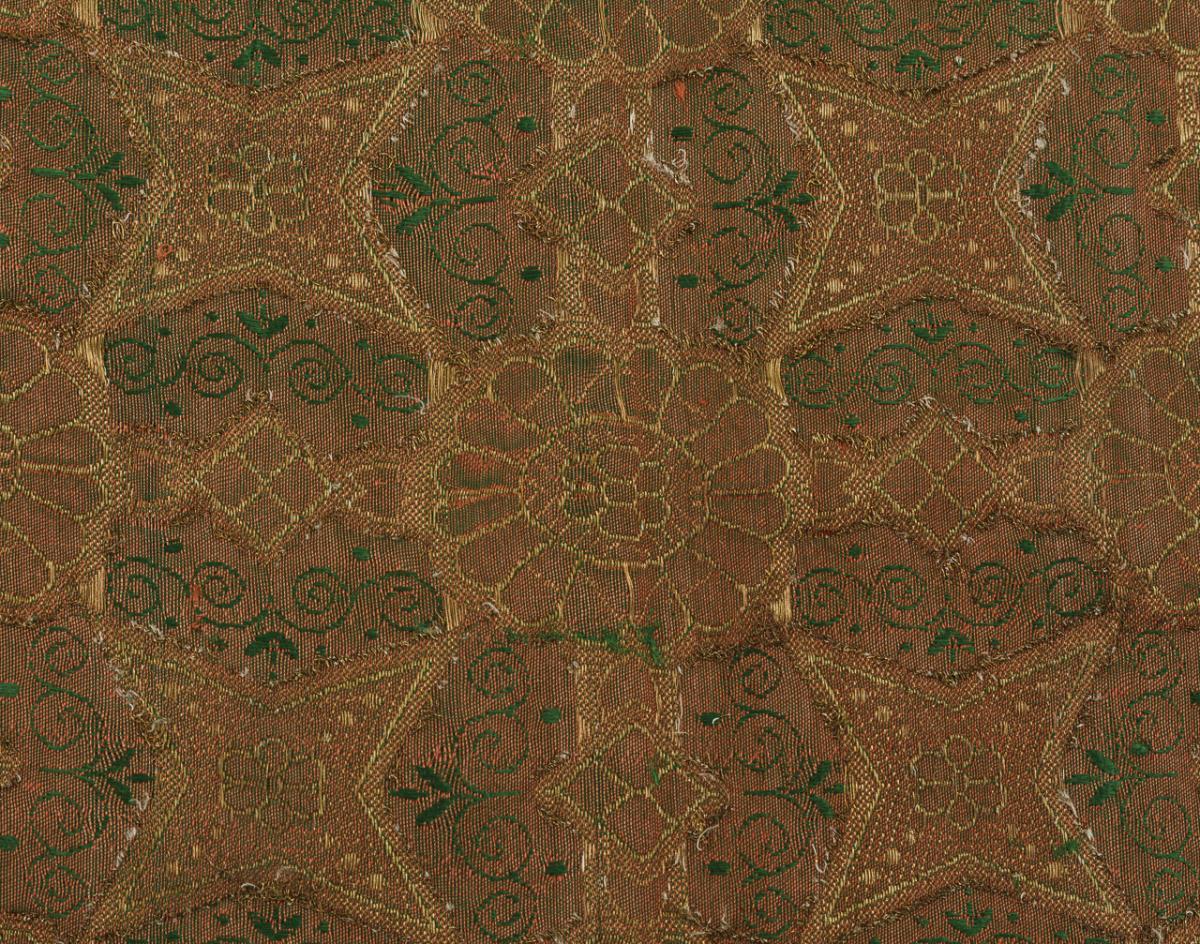 According to the light, iridescent fabric with medallion star repeat also in the border. Few spots.