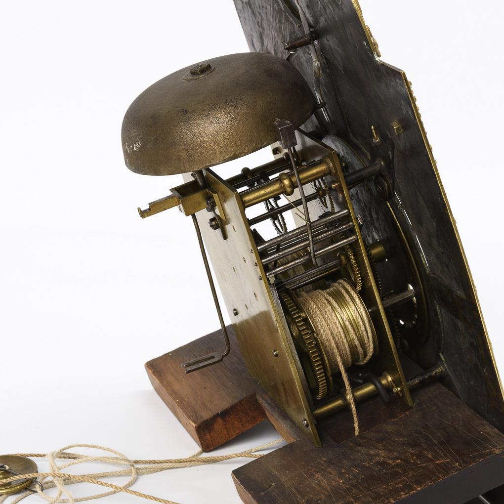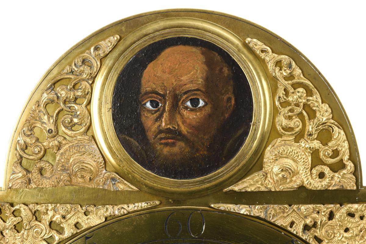brass movement with hour strike on bell, function not tested, revision recommended. "Will[ia]m Harris, Salop" inscribed brass dial with floral and figural applications, Roman hours and Arabic minutes, small seconds and date indication at 6, Louis XV iron hands. In the round arch field a male portrait as an eye turner.