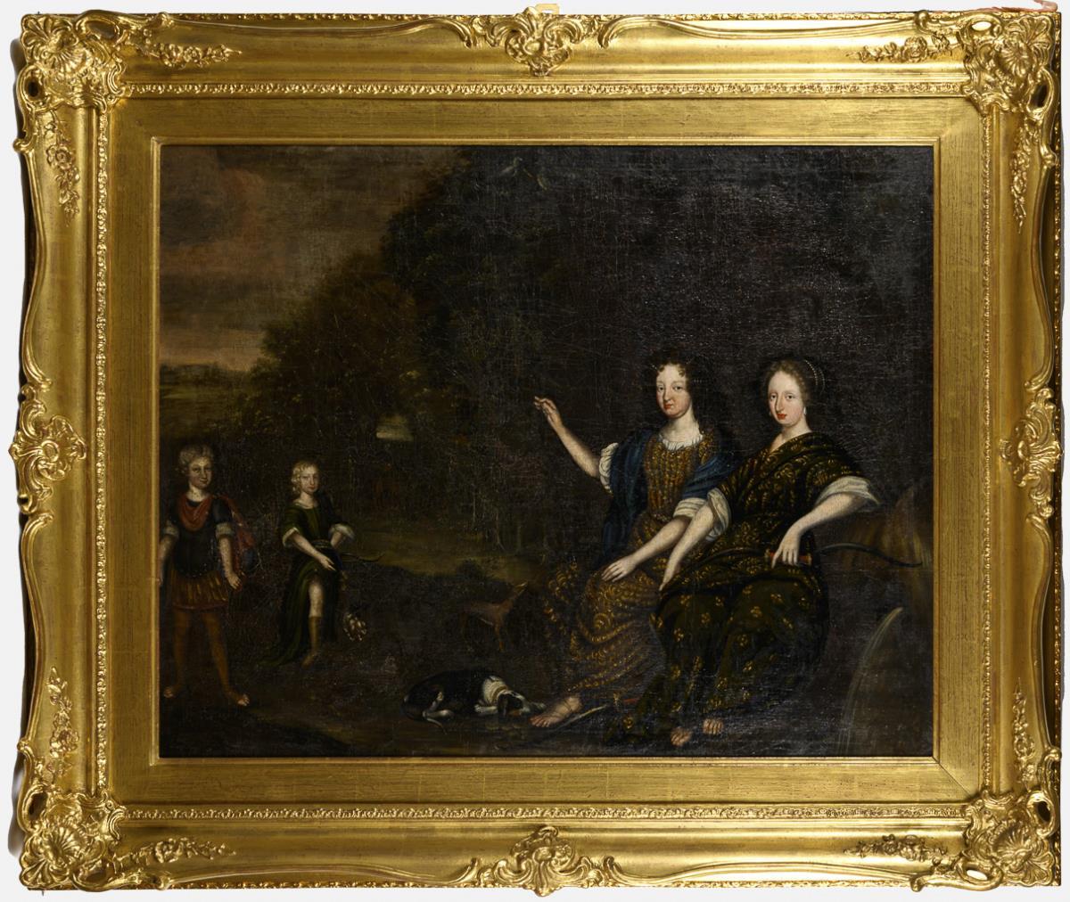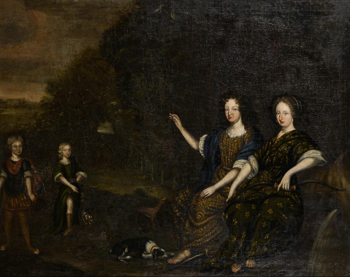 Two seated women with bows and arrows and two boys with hunting dogs in front of a forest. In need of restoration.