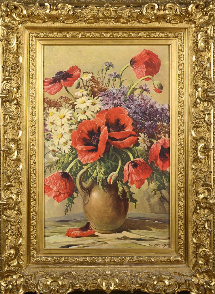 Overly rich with rocailles and flowers reliefed frame. Magnificent bouquet of flowers "E. Krüger" inscribed. A few glue and missing parts.