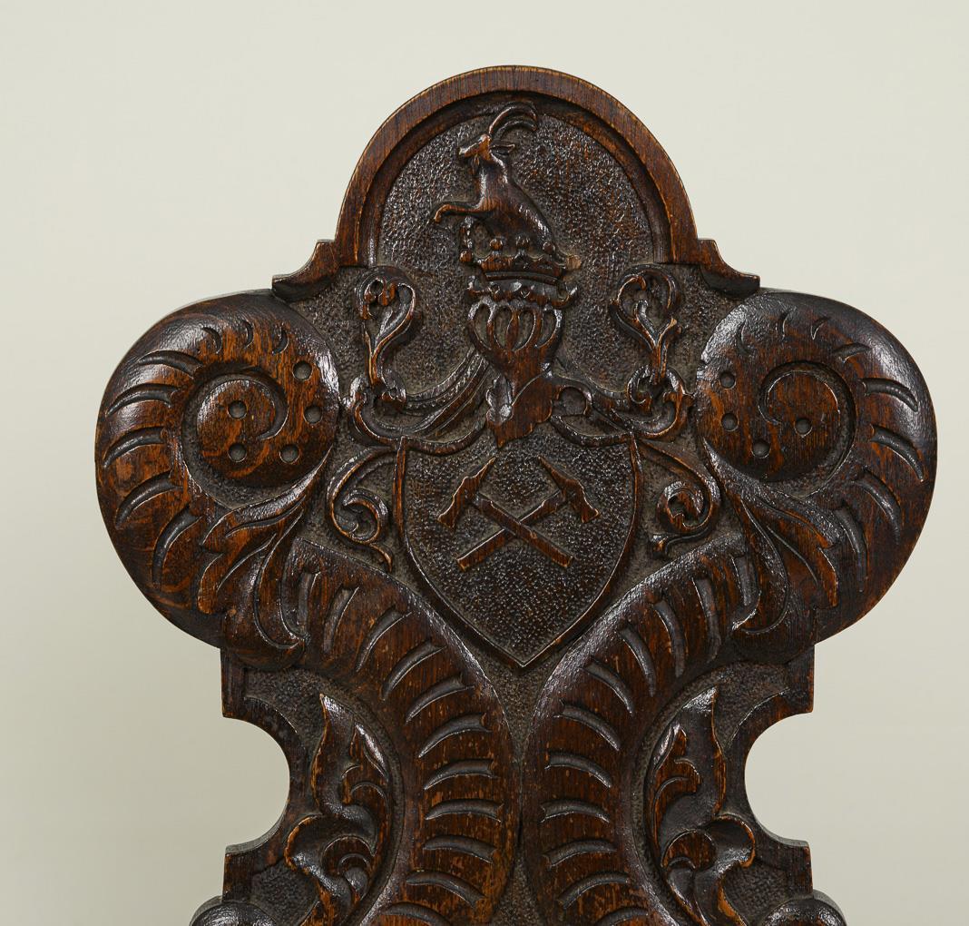 4 board chairs with trapezoidal seat with oak leaf embossed leather cover and decorative nailing, lushly carved backrest in the form of grotesques and coat of arms with crossed mountain irons, on 4 lathe legs. Signs of age/use, leather cover with defects, dry cracks.