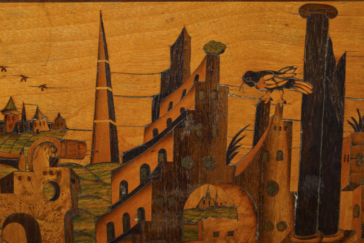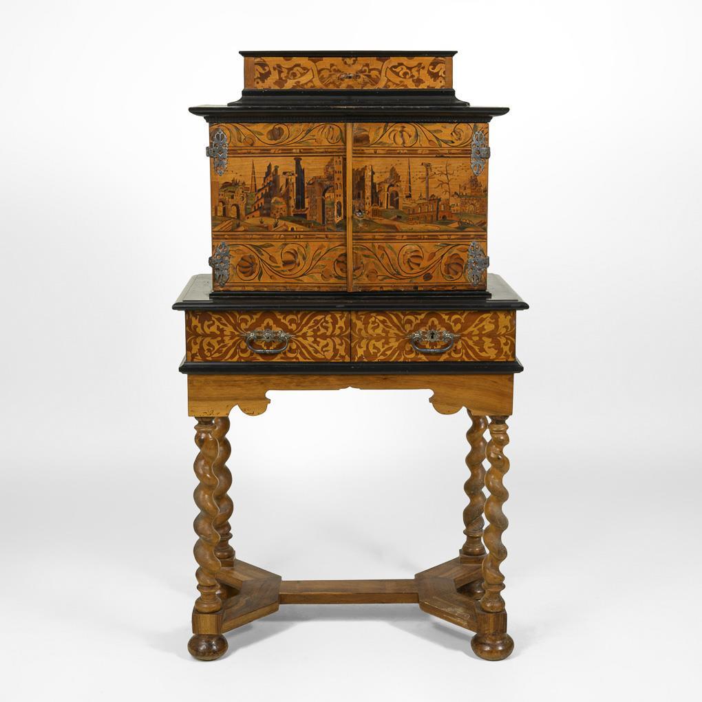 Representative, splendidly decorated, 2-winged gallery cabinet with Blender head drawer, set on 2 drawers side by side, on 4 spiral columns with foot bracing and flattened ball feet; equipped with 7 small drawers and 1 larger drawer, as well as 1 middle compartment with volute metal handles for storing curios and precious items. The hinged doors are decorated with fine marquetry in the form of a Greco-Roman ruined landscape and delicate floral vines, the side panels and drawers are decorated with mirrored vine work; When opened, the hinged doors on each side display a coat of arms with noble and count's crown (abbreviation "BZZ" and "SDZD", dated "1584" below) framed by fine three-dimensional scrollwork marquetry; the drawers are lavishly inlaid with mounts and vine work. 4 keys. Signs of age/use, restored with additions, frame younger.