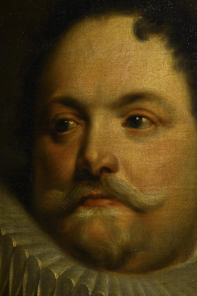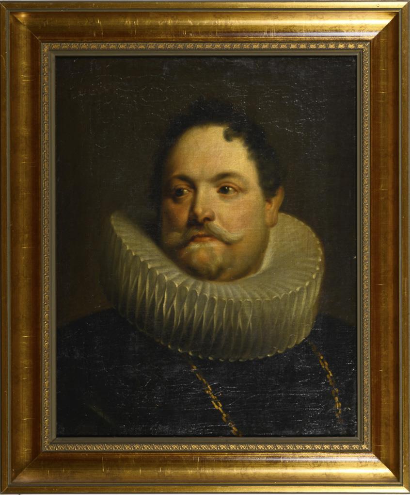 Portrait of a man in Renaissance dress with ruff and gold chain. canvas doubled.