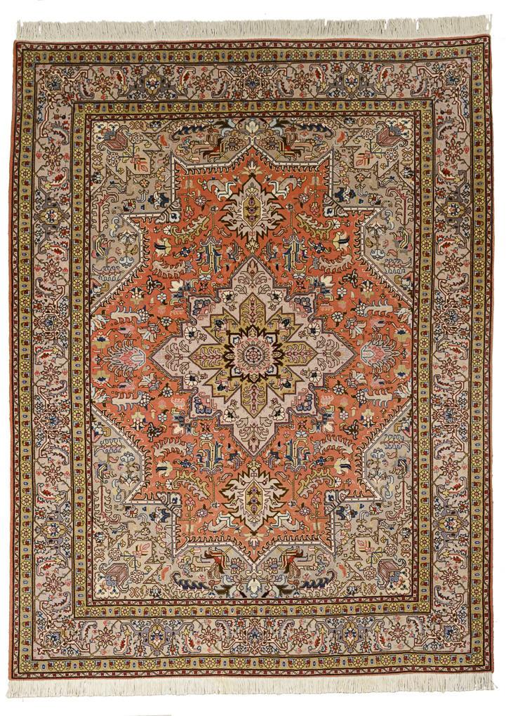 Wool and silk, hand-knotted. Bright polychrome decoration. Approx. 153 x 207 cm.