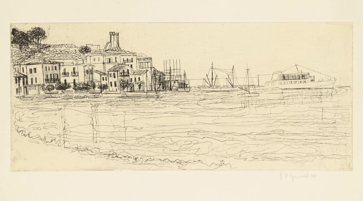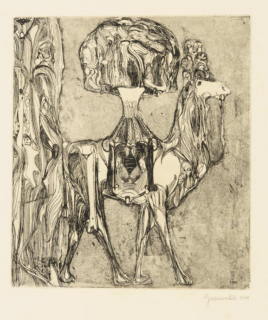 Southern city on the water, plate: 19.7 x 45 cm, sheet: 38.3 x 54 cm, 1961, some traces of grip | Landscape on the water, plate: 19.7 x 28.5 cm, sheet: 38 x 53.5 cm, 1963, margins somewhat browned | Adorned Llama, plate: 22 x 19.5 cm, sheet: 54.5 x 38 cm, 1964, margins somewhat browned | Three Ladies in a Barren Landscape, plate: 23.5 x 34 cm, sheet: 38 x 54 cm, margins somewhat browned.