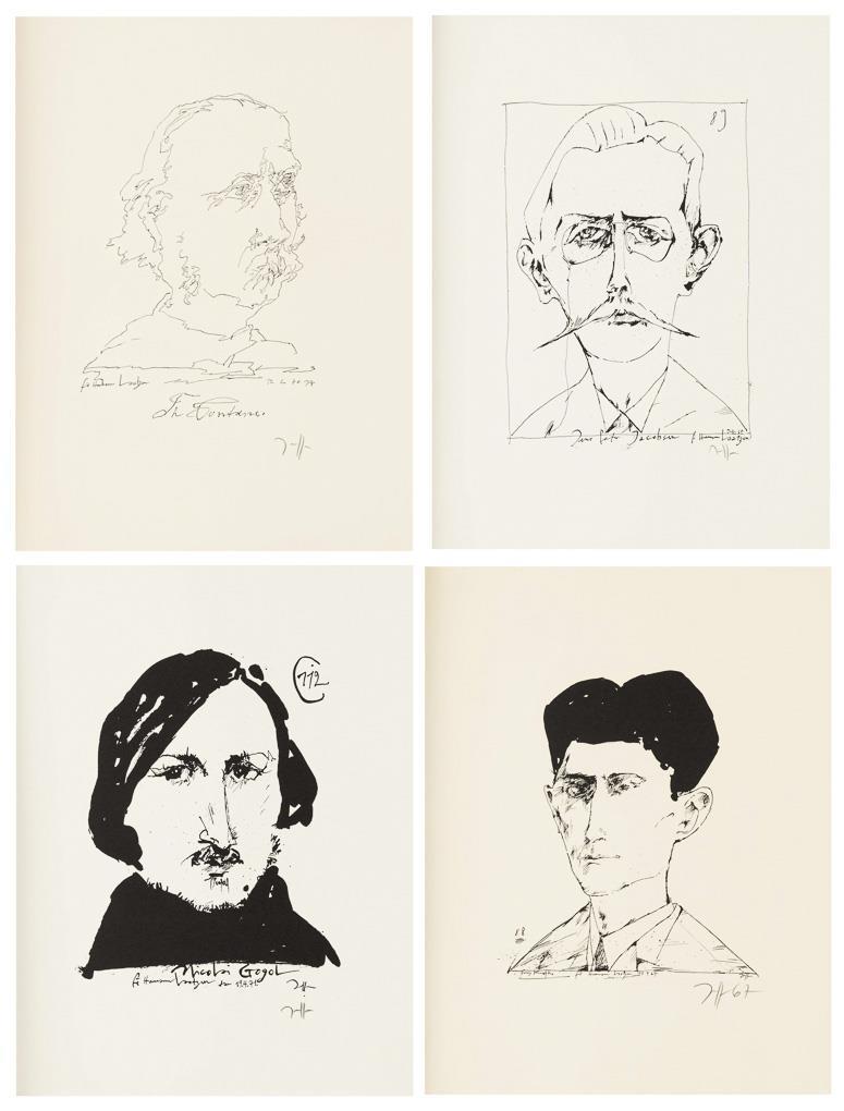 "Nicolai Gogol", sheet: 37 x 28 cm, [19]71 |"Theodor Fontane", sheet: 37 x 28 cm, [19]70 |"Jens Peter Jacobsen", sheet: 37 x 28 cm, [19]67 and "Franz Kafka", sheet: 38 x 29,5 cm, [19]67; from the series "Dichterköpfe" for the bookstore Hermann Laatzen in Hamburg.