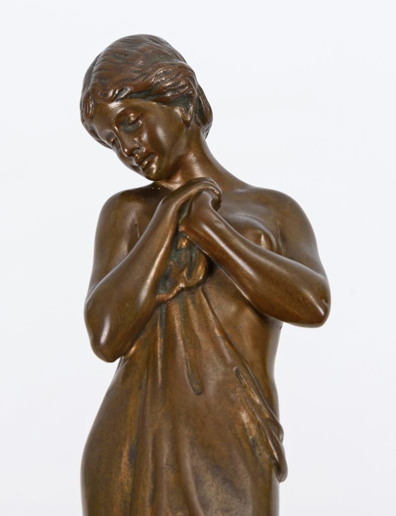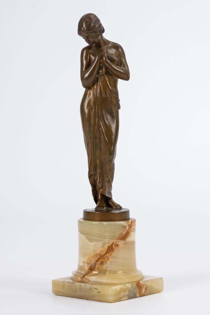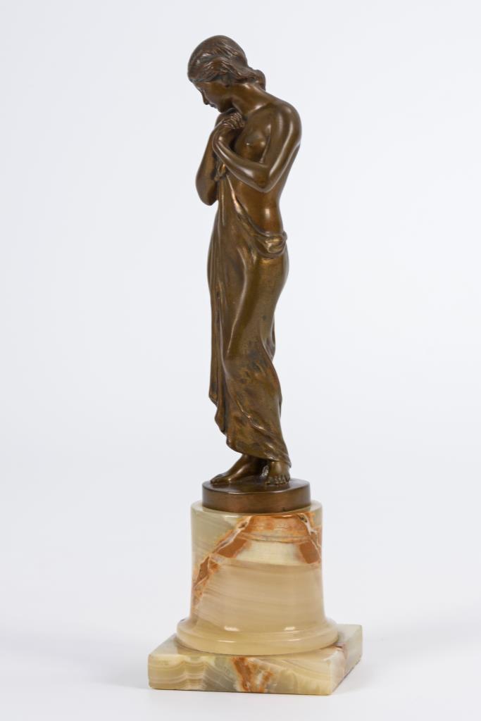 Bronze patiniert, Sockel aus teils braunem Onyxmarmor.Bezeichnet, Gießermarke "Act.Ges. Gladenbeck. Berlin.".H 17,5 / 23,5 cm.