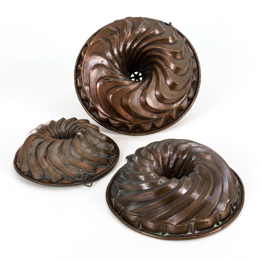 Backformen je mit Spiralmuster sowie Hängeöse. Je durchgescheuert bzw. Lötreparaturen, Alters-/Gebrauchsspuren.
