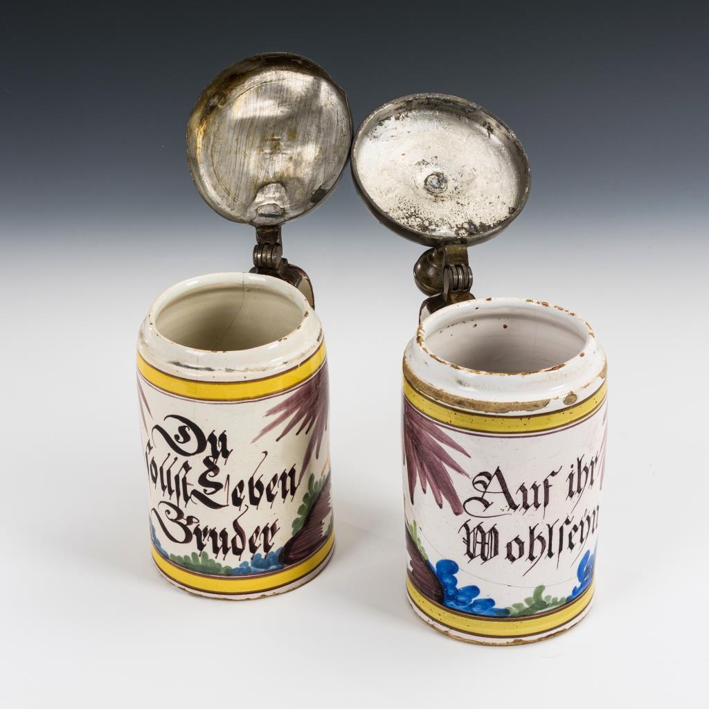 Walzenkrüge mit Sprüchen "Auf ihr Wohlseyn" und "Du sollst leben Bruder" zwischen Baumstücken. Flache Zinndeckel mit Kugeldrücker. Fayence und Deckel mit Defekten.