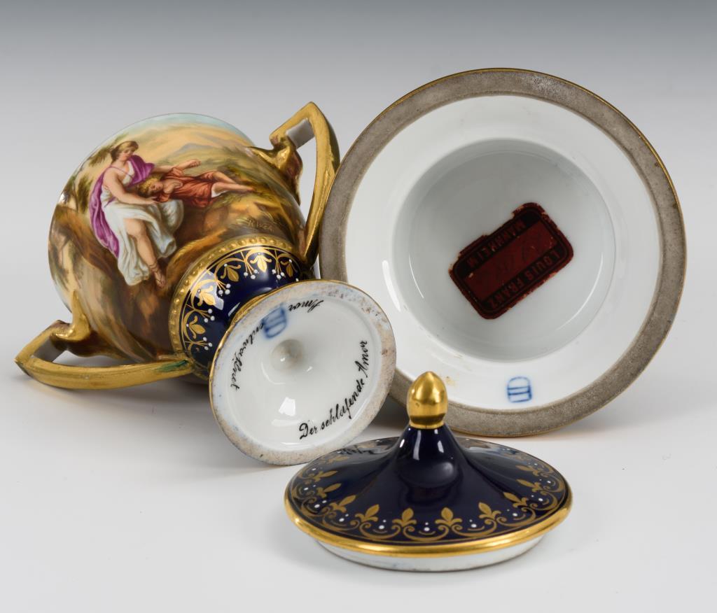 Halbovoide Vase mit zwei gewinkelten Henkeln, Knaufdeckel und Rundfuß, auf rundem Sockel. Kobaltfond mit ornamentaler Goldmalerei mit weißen Emailpünktchen, umlaufend gemalte mythologische Szenen.