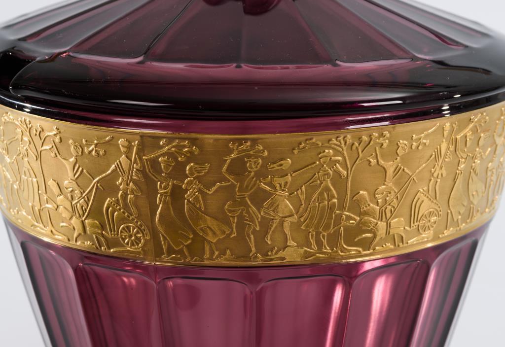 Konische, pseudofacettierte Bowle mit Knaufdeckel und entsprechend gestalteten konischen Bechern. Umlaufend ein figürlicher Fries.