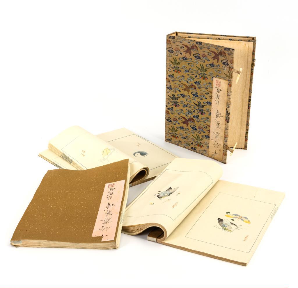 Drei Hefte in einem Schuber. Mit einer Vielzahl von unterschiedlichen Darstellungen in Farbholzschnitten, teils mit Prägedruck. Einzelne Gegenstände, Landschaften, Blumen und Schmetterlinge u.v.a.m.. Gebrauchsspuren, ein Heft mit gelöster Bindung.