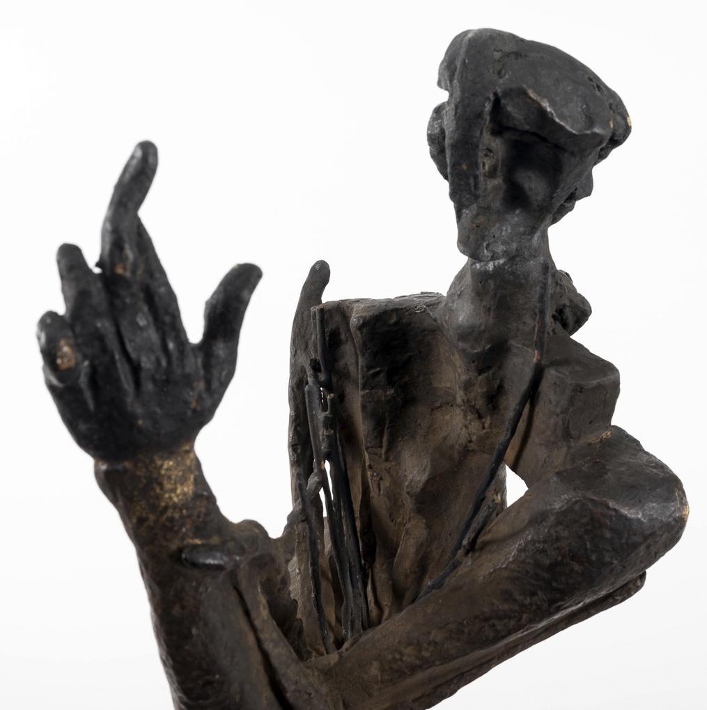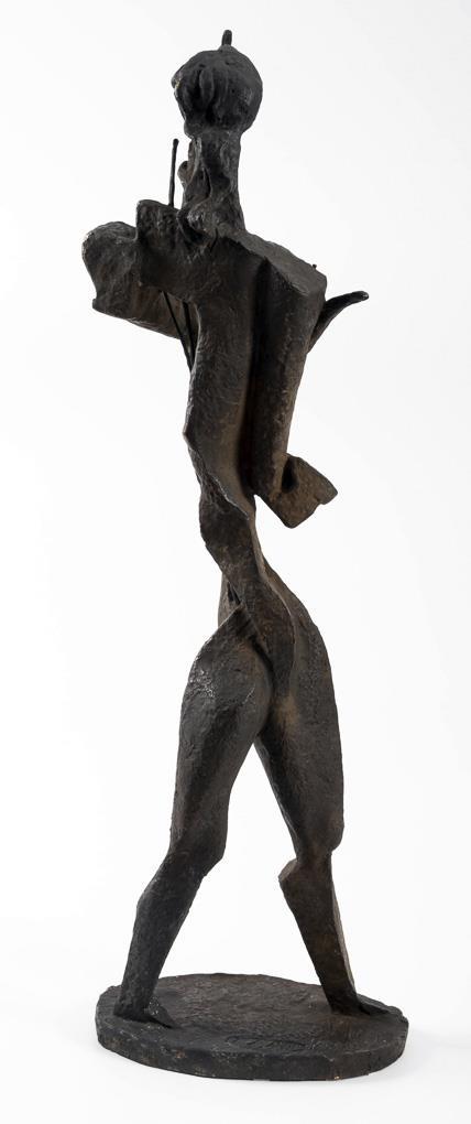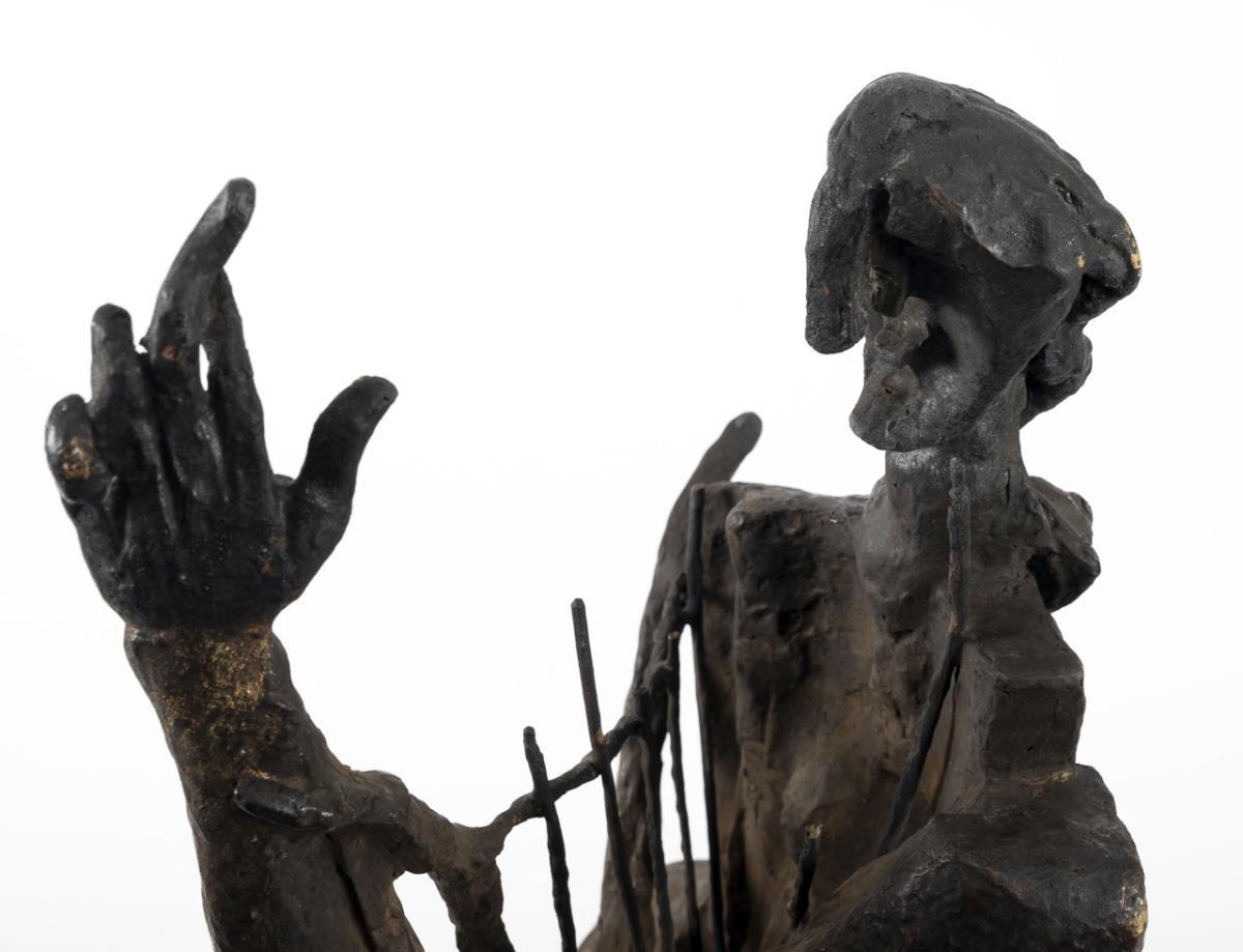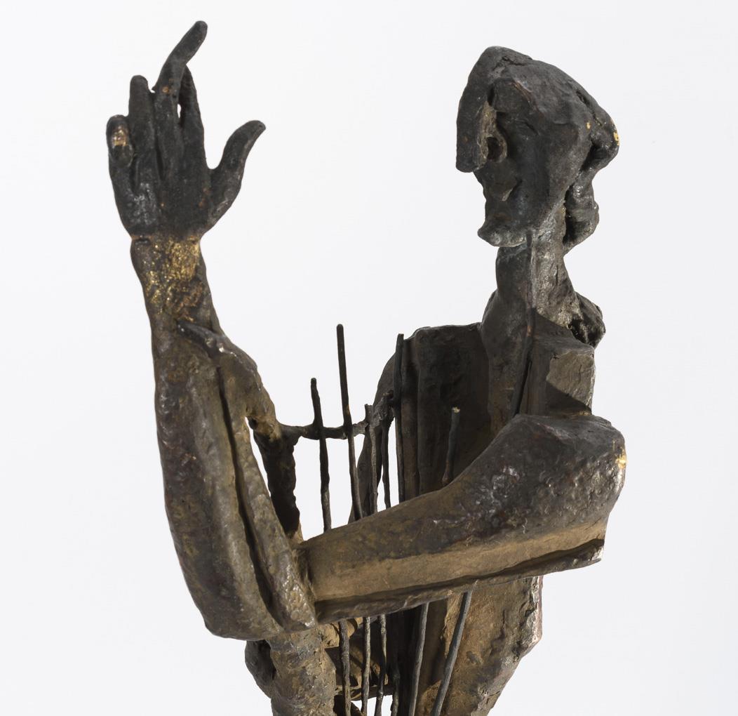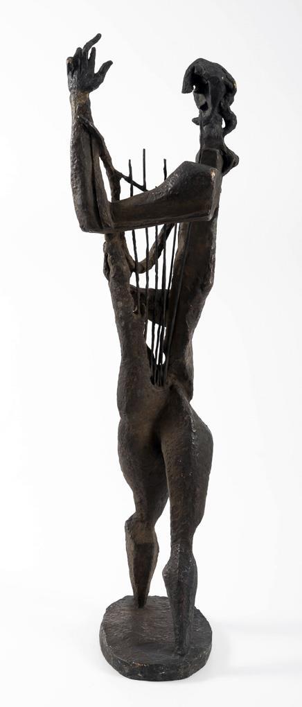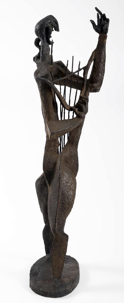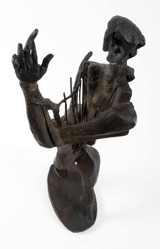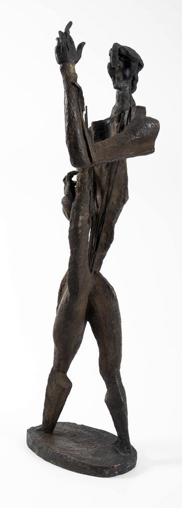 Cubist standing figure of the mythical singer of antiquity with his lyre in the version of 1960. The artist was engaged in this theme since 1930 and created a total of seven versions. . 4 string tips missing, 2 with bend marks, damage to the patina, hairline crack casting defects in the bronze plinth.