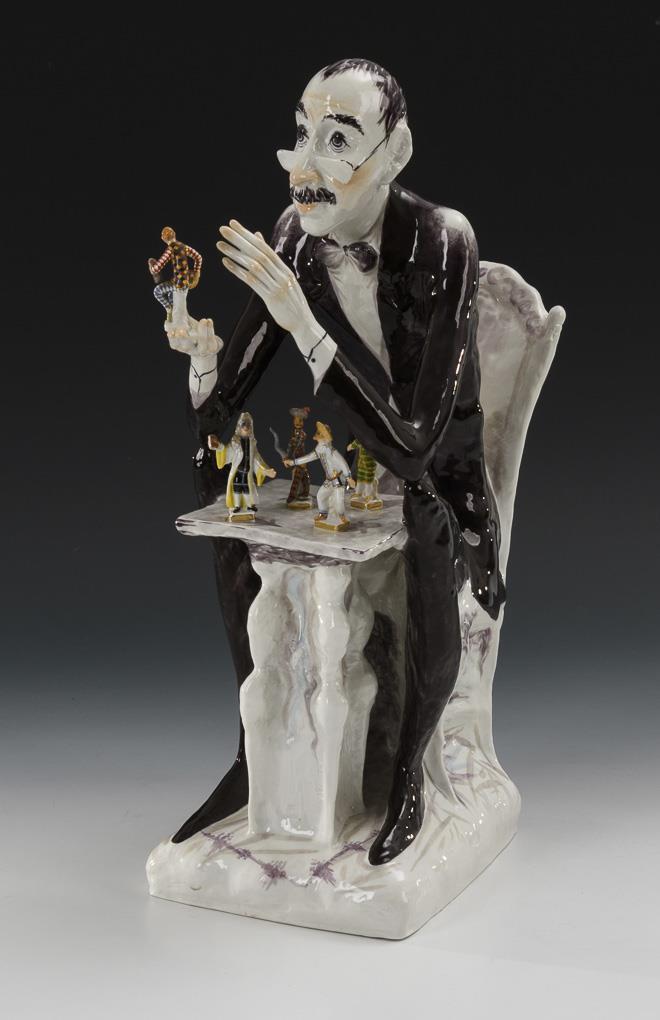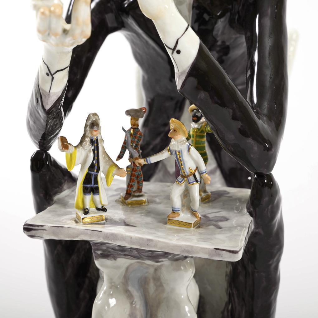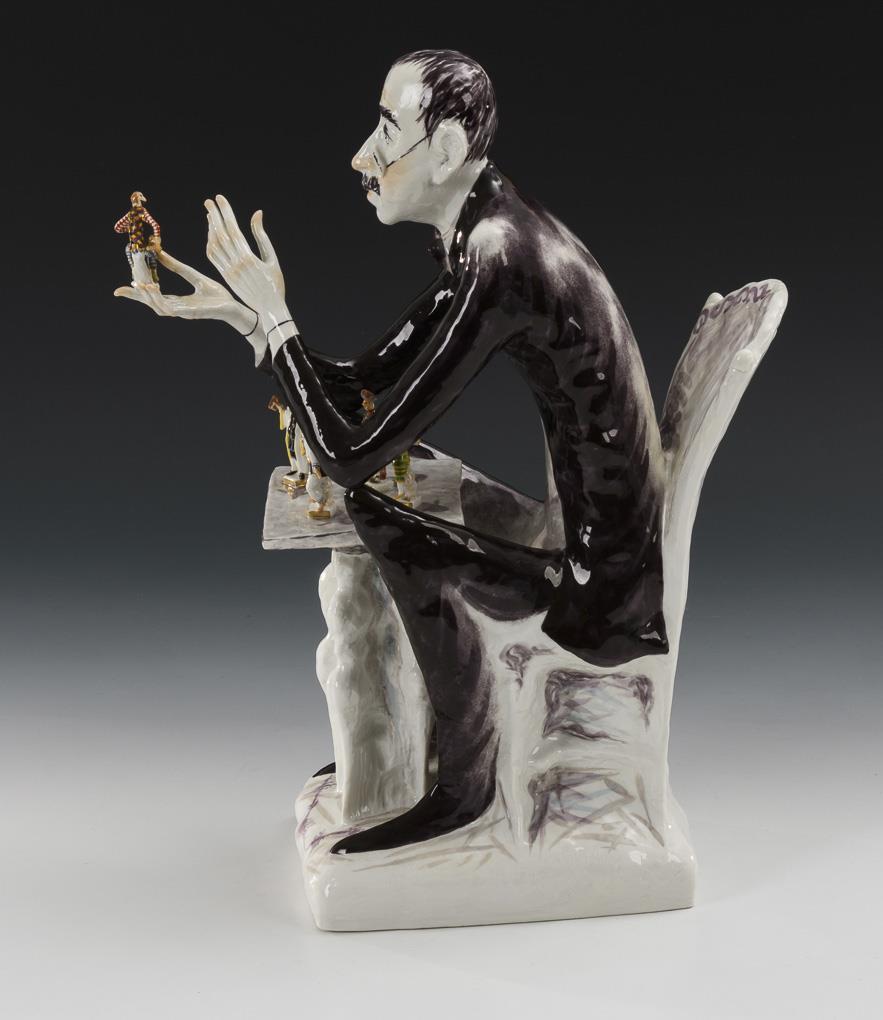 Peter Strang designed the sculpture after experiencing the feature film "Utz" on the occasion of the Berlinale 1992. The sculpture shows the passionate collector Baron von Utz with figures of the "Commedia dell'arte" designed by Johann Joachim Kaendler for the porcelain manufactory Meissen. The figure represents actor Armin Müller-Stahl, who stars in the film as Baron Kaspar Joachim von Utz.