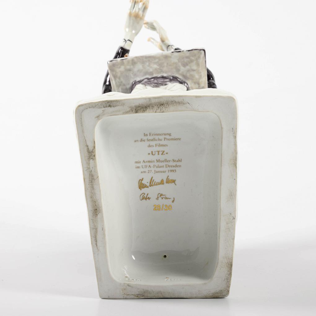 Picture of the actor Armin Müller-Stahl sitting at a table looking at porcelain figures of "Commedia dell'arte. Inscribed on the underside "In memory of the festive premiere of the film "UTZ" with Armin Müller-Stahl at the UFA Palace Dresden on January 27, 1993", signed by Armin Müller-Stahl and Peter Strang.