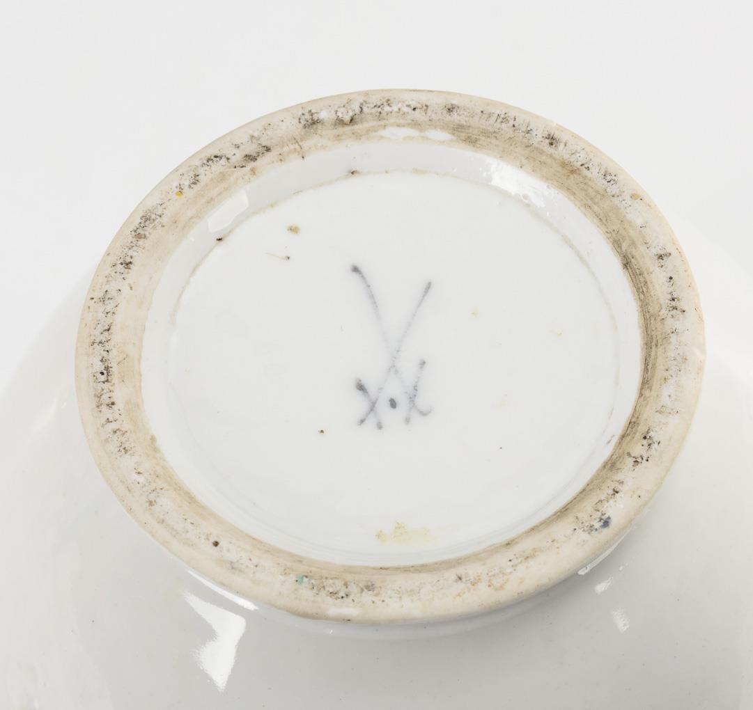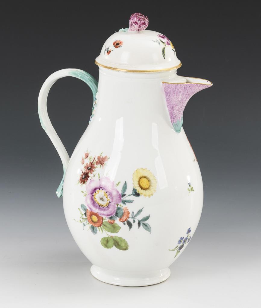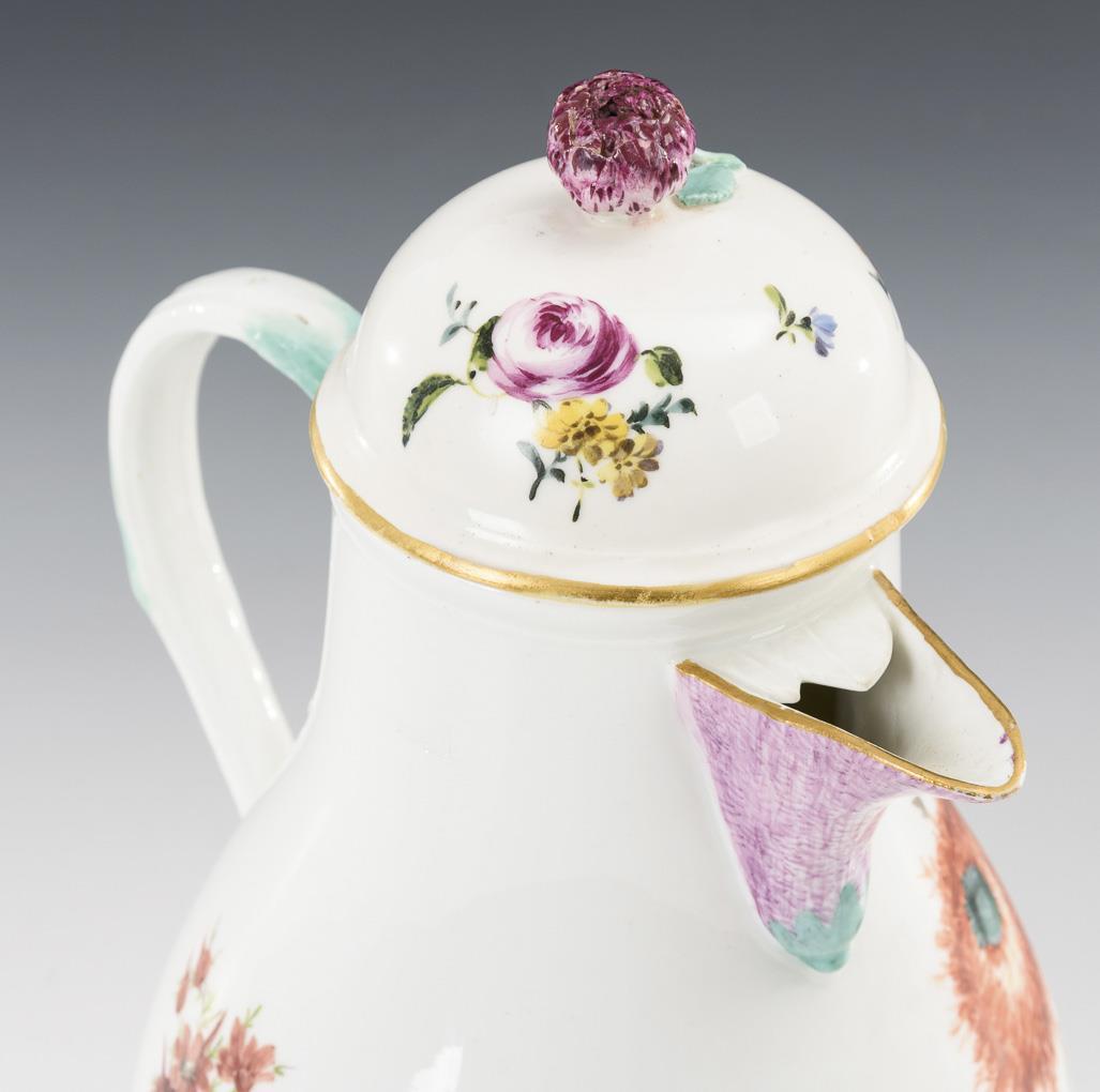 Pear jug with flower knob lid and branch handle. On both sides a large floral bouquet. Lid rim and knob restored.