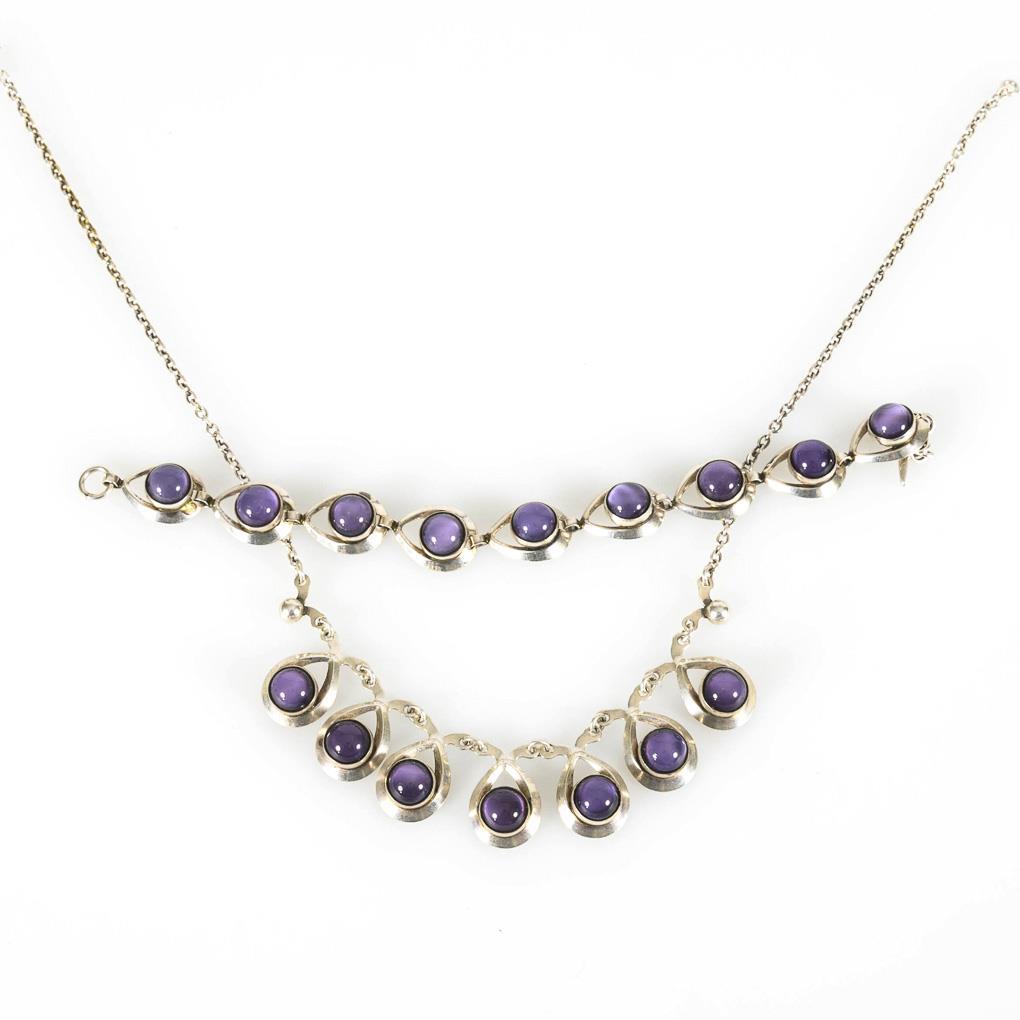 Collier and bracelet with purple-backed cabochons in closed bezel settings. Anchor chain with ring spring clasp. Toggle clasp.