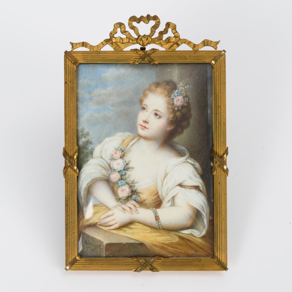 Sehr fein gemaltes Bildnis der jungen Frau mit Rosen. Minimale Alters-/Gebrauchsspuren.