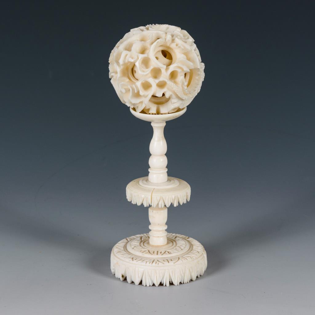 Vermutlich 7 Kugeln, durchbrochen gearbeitet. Gedrechselter Ständer aus mehreren Teilen. Außenkugel mit reliefiertem Drachen.
