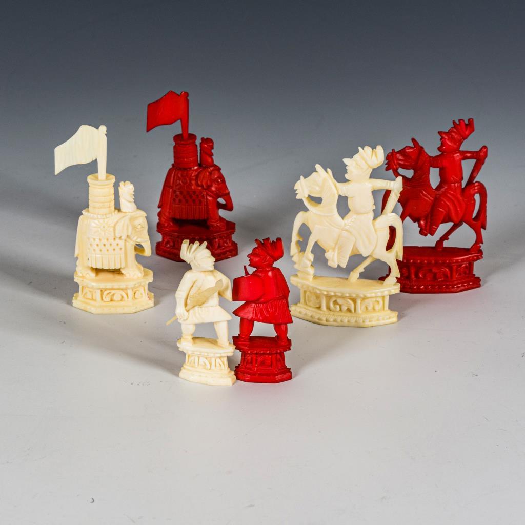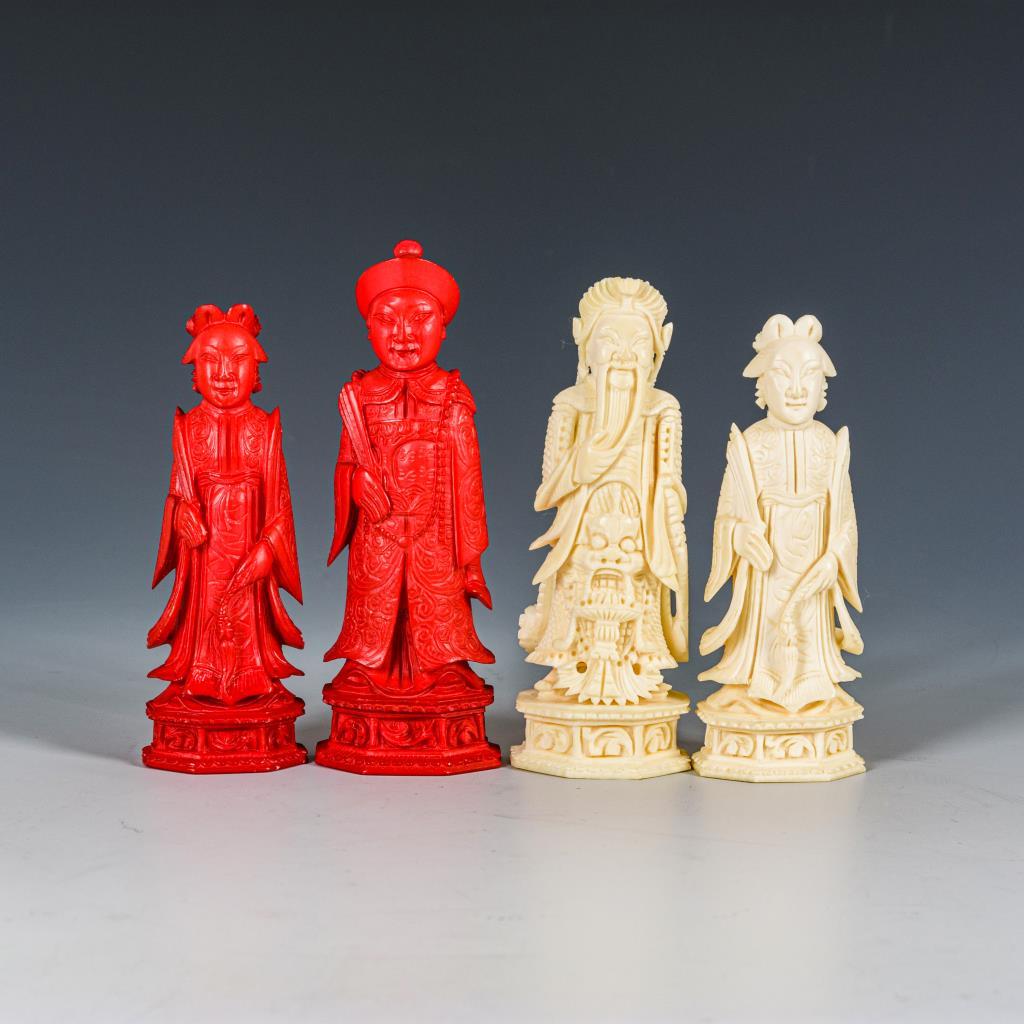 Teils rot gefärbte Figuren in chinesischen Trachten, Turm als Elefant. Minimale Defekte, z.B. bei den Schwertern der Bauern oder Bereibungen, Fahne eines Elefanten fehlt. Pappkarton mit Fächern. Äußerer Papierbezug defekt.
