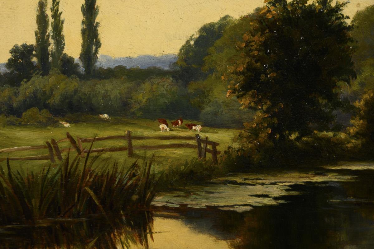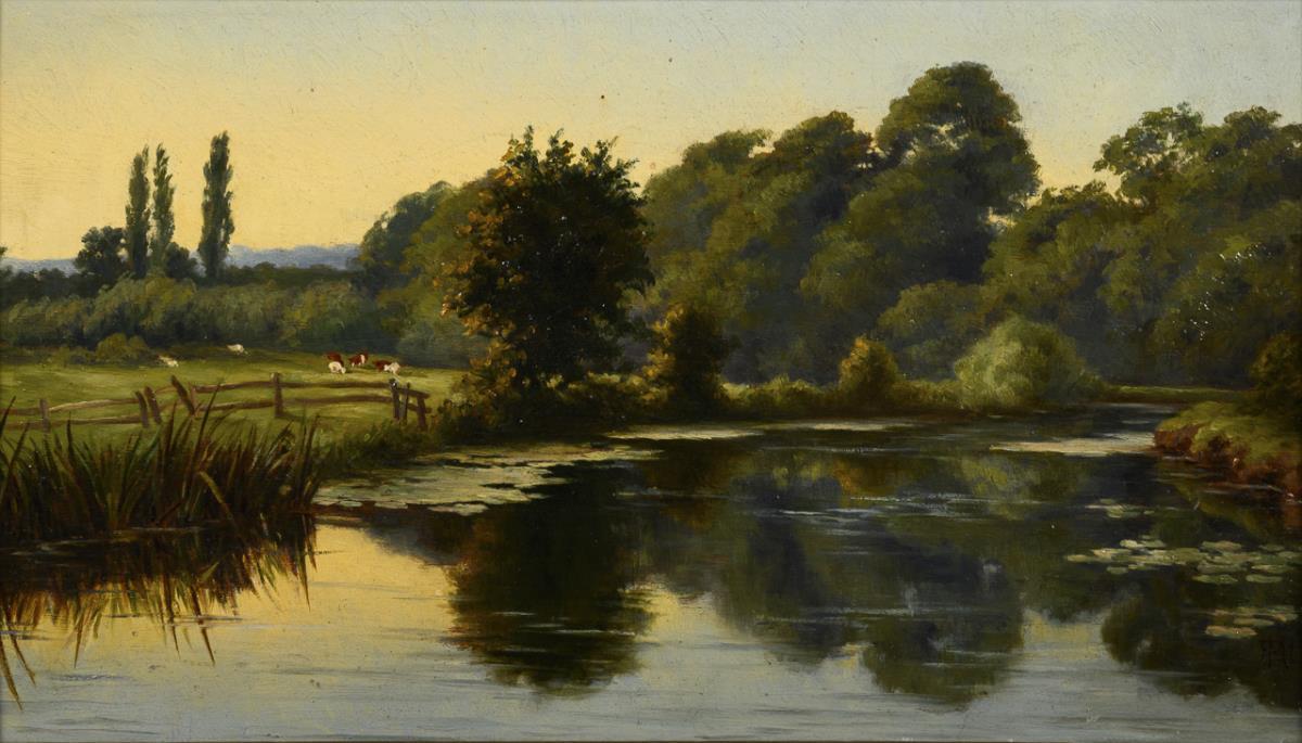 River bend with adjacent pasture and cattle in the sunshine.
