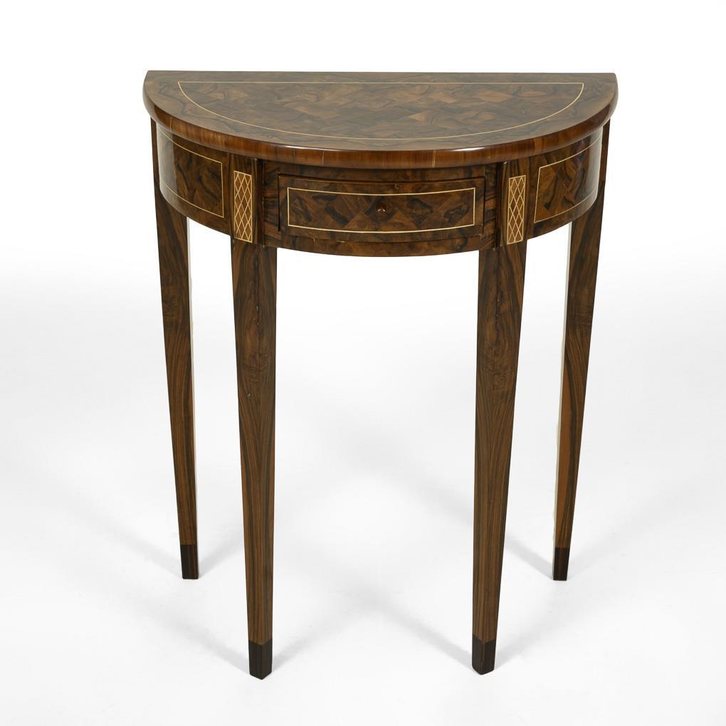 Dainty half-moon wall table on 4 pillar legs, with parquetry burl veneer.