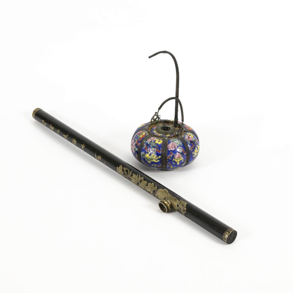 Rod-shaped pipe made of black lacquered wood and engraved metal inlays and inlaid characters. Signs of age and use, L 54.5 cm. / Marked porcelain vessel in the shape of a pumpkin with metal frame and narrow opening. Signs of age, total H 24 cm.