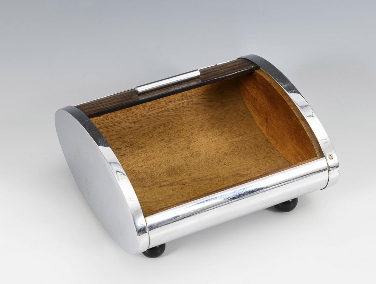 Various metals, partly chromed, partly black lacquered, rosewood, probably brown lacquered goatskin. H 60 and 22 cm respectively, casket 8 x 15 x 14 cm.