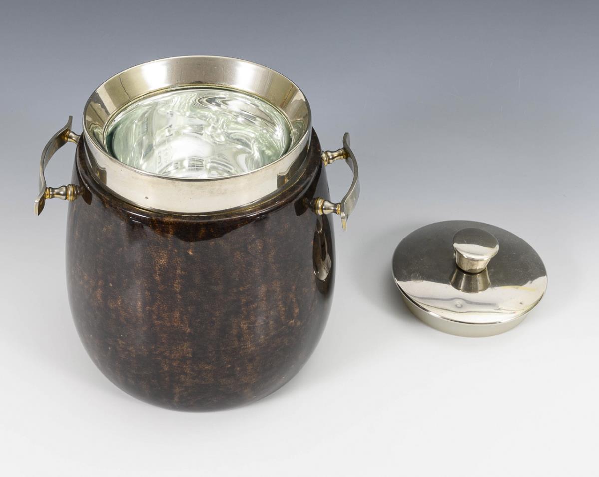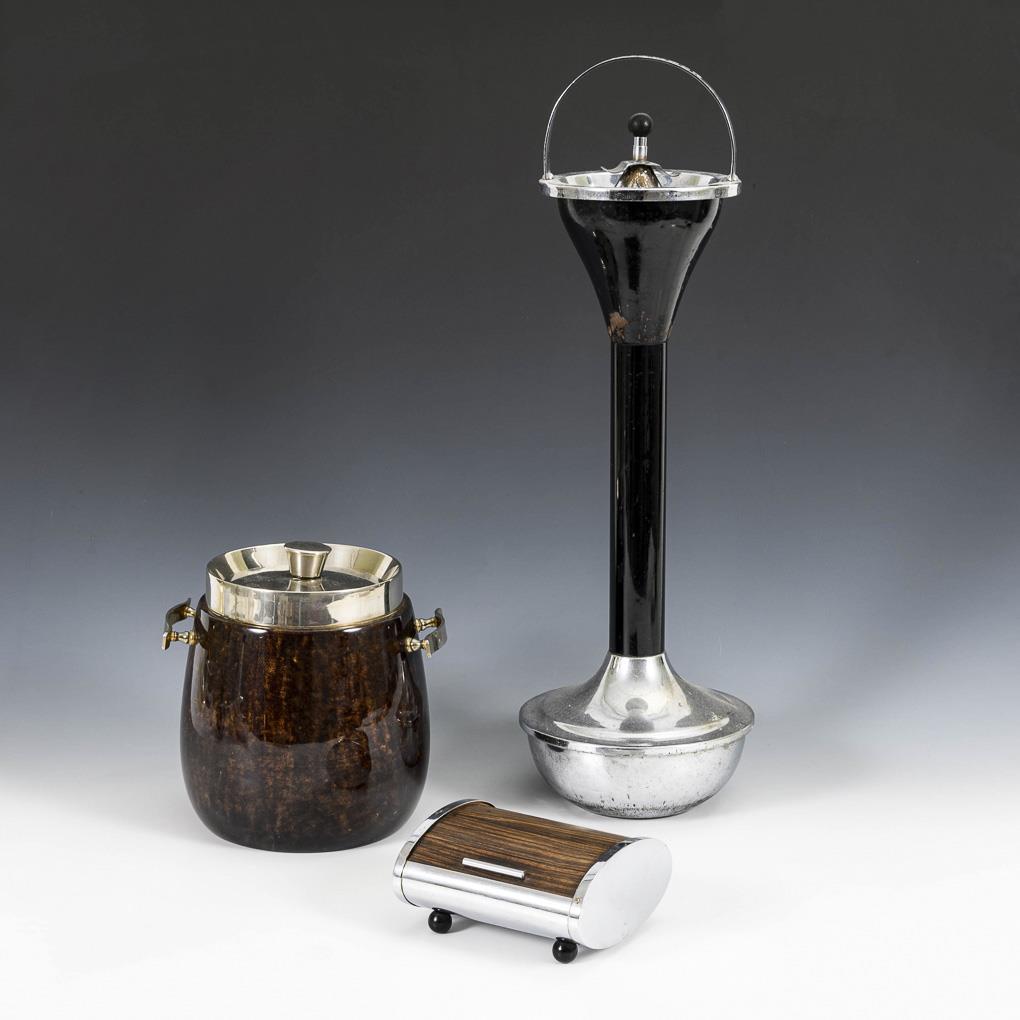 Tall ashtray with weighted base and clasp; carrying handle advertising inscription "Salamander". / Brown lacquered ice box with metal handles and lid probably by Aldo Tura; inside with glass thermo container. / Chromed casket for cigars(?) with rosewood roll closure. Ashtray stronger signs of age / use, otherwise barely.