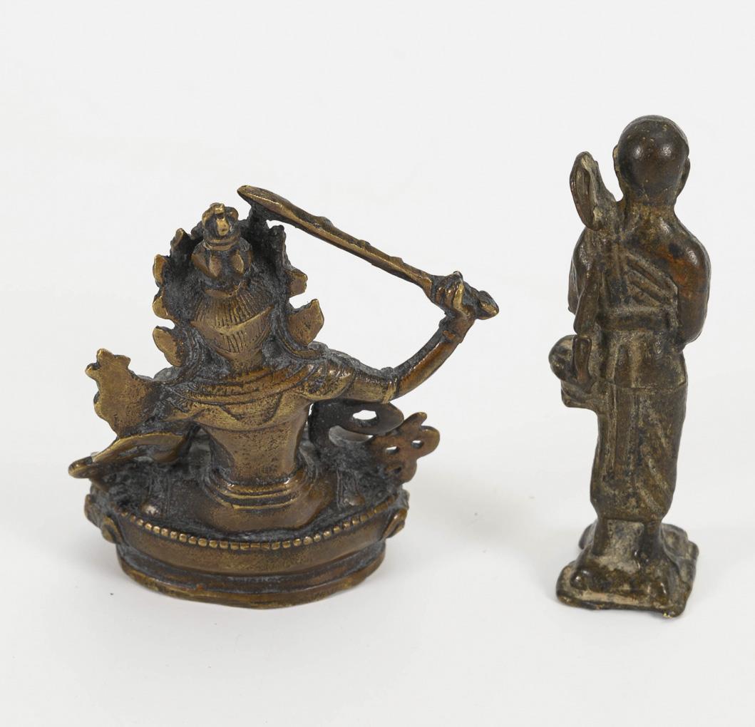 Small figure of saint in interlocking seat with raised sword. Bottom closed, h 8 cm. / Standing monk(?) with vessel, fan and snake (possibly healer), h 7.5 cm.