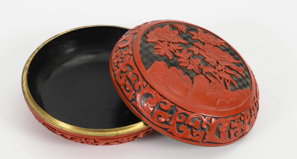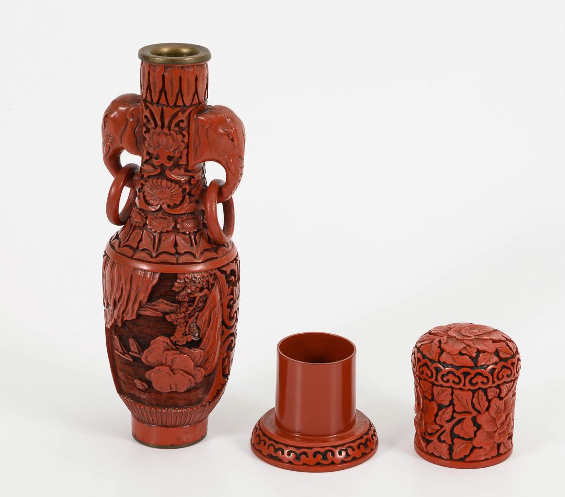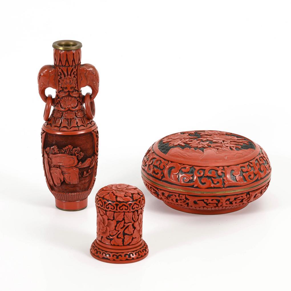 Flat box with peony relief on the lid, Ø 18 cm. / Vase with two different waterscapes as decoration and elephant heads as handles. H 23 cm. / Cylindrical box with flowers. H 8 cm.