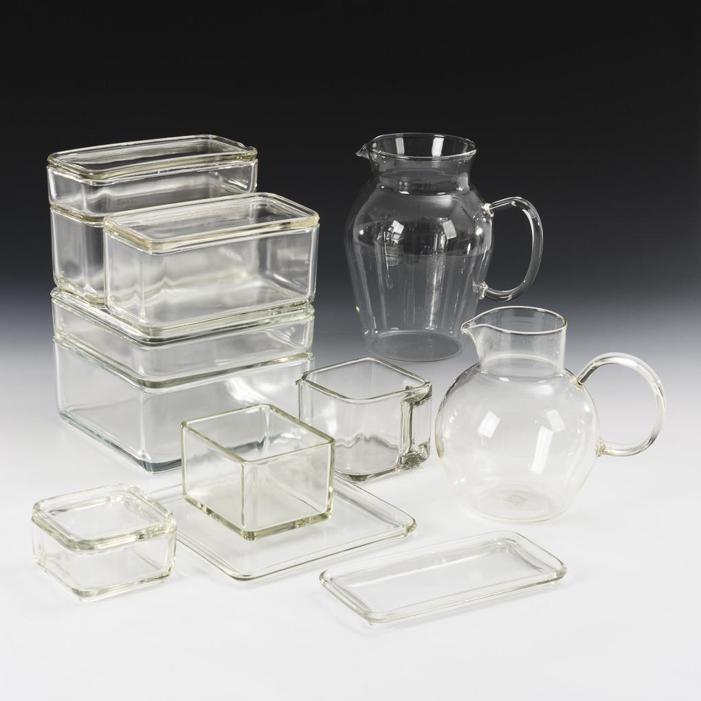 Vessels unmarked, probably execution Vereinigte Lausitzer Glaswerke AG Weißwasser; 1 jug square mark Schott, 1 jug unmarked. Tableware "Kubus" design: 1938. WAGENFELD, Wilhelm(1900 Bremen - 1990 Stuttgart)