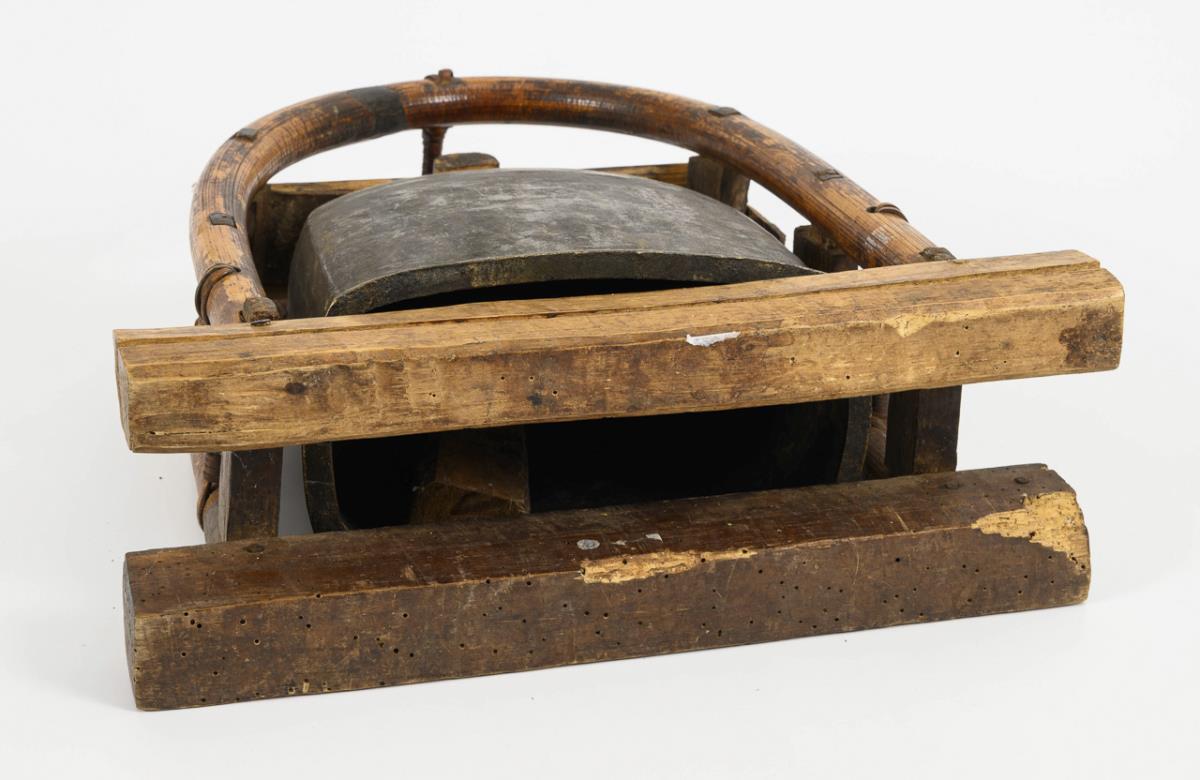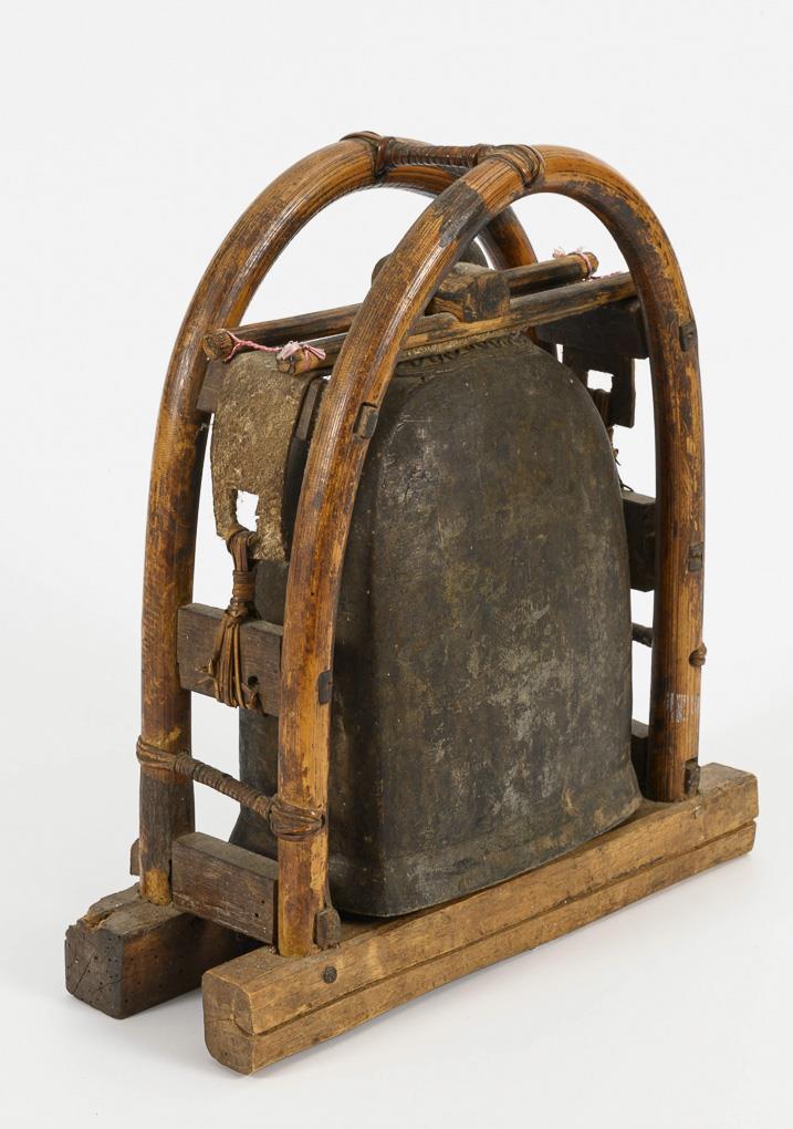 Metal bell with wooden clapper, fixed in rattan frame. Metal body with small decoration around the top eye.