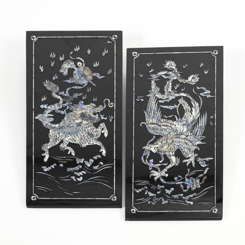 2 panels with mother of pearl inlays: phoenix and qilin.