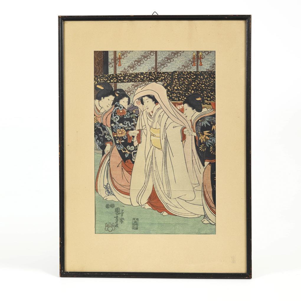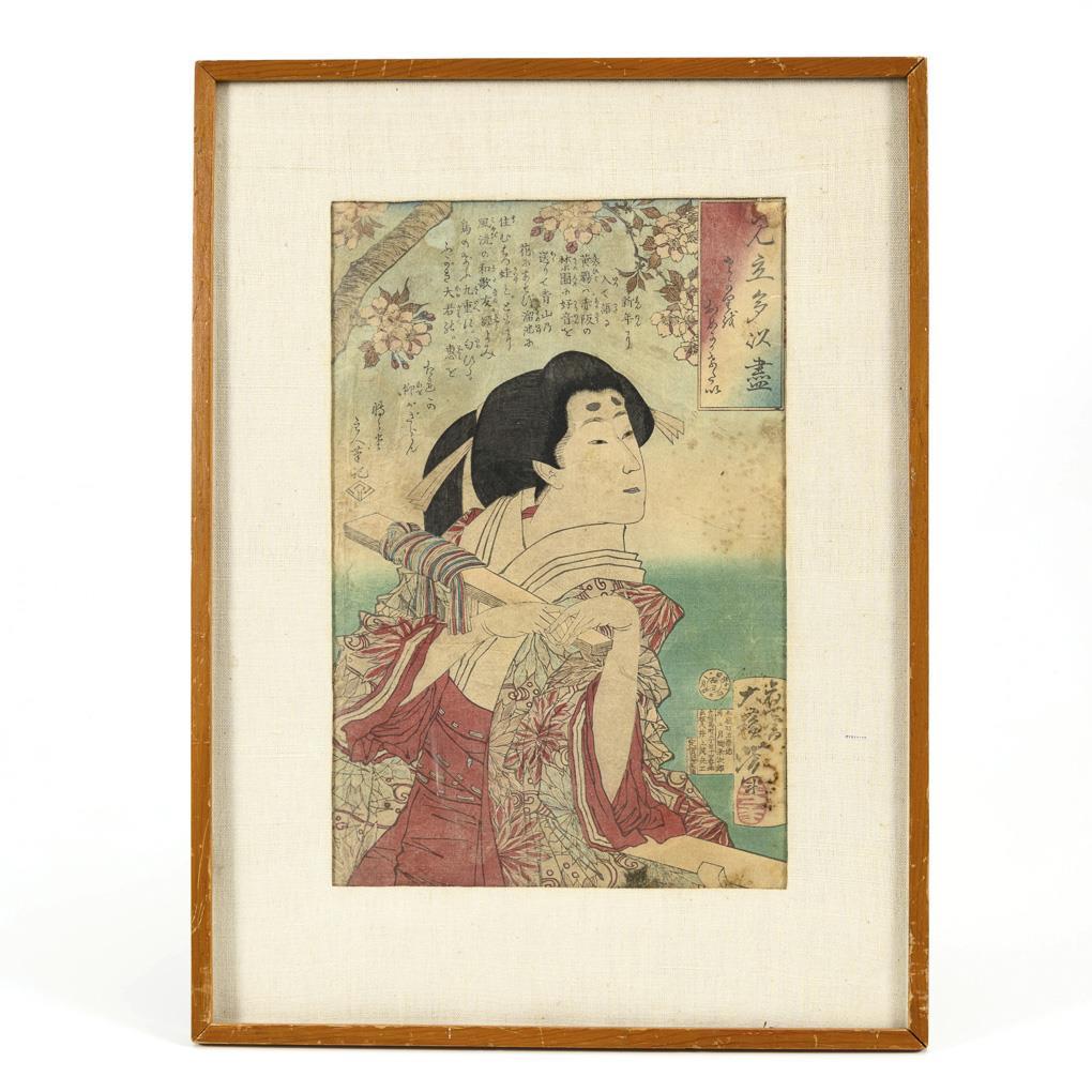 Kuniyoshi: Ladies leading a bride(?) / Woman with bound script leaves under flowering cherry tree. Larger text block. Sheet faintly foxed.