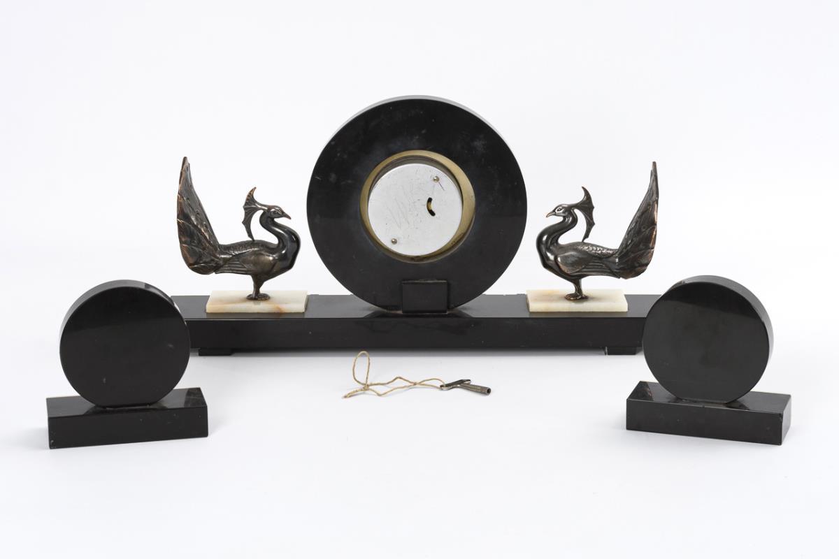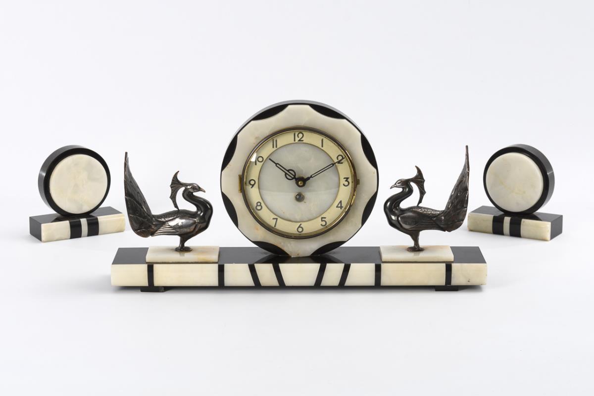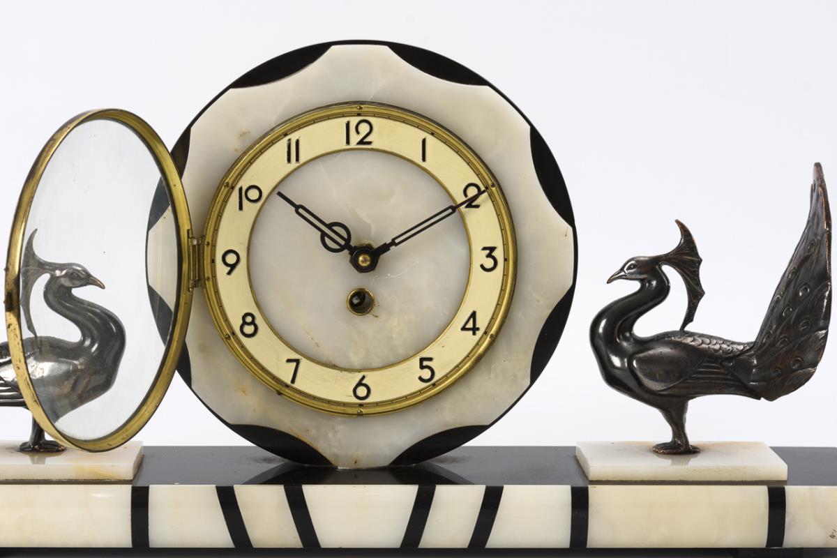 Flat base with round clock case and 2 flanking sculpted peacocks. 2 disc-shaped side plates. Partial light edge wear, 1 peacock repaired.
