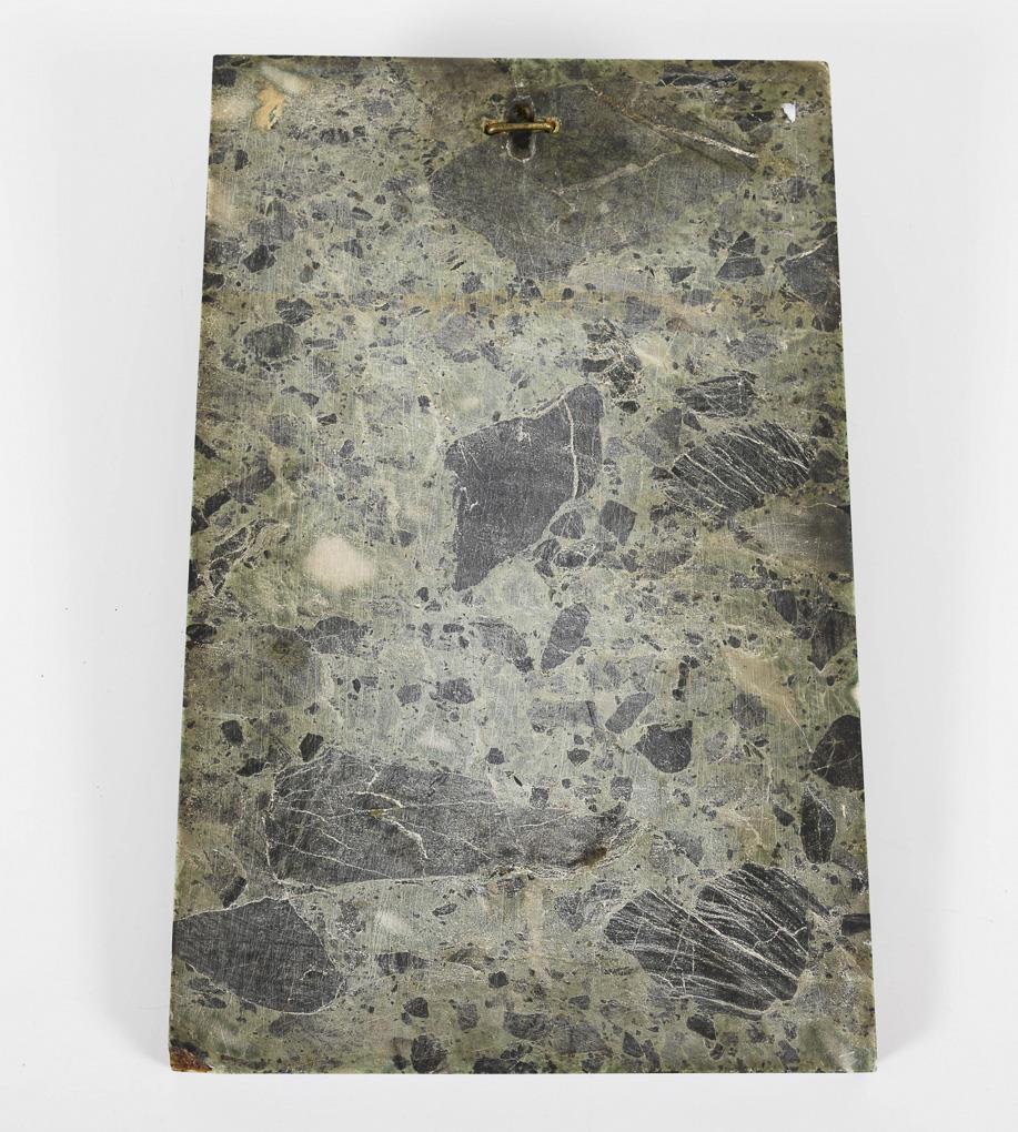 Gold bronze, green/black marble plate. Inscribed with monogram. Ø 19 cm / 38 x 24 x 2 cm. 5.1 kg.