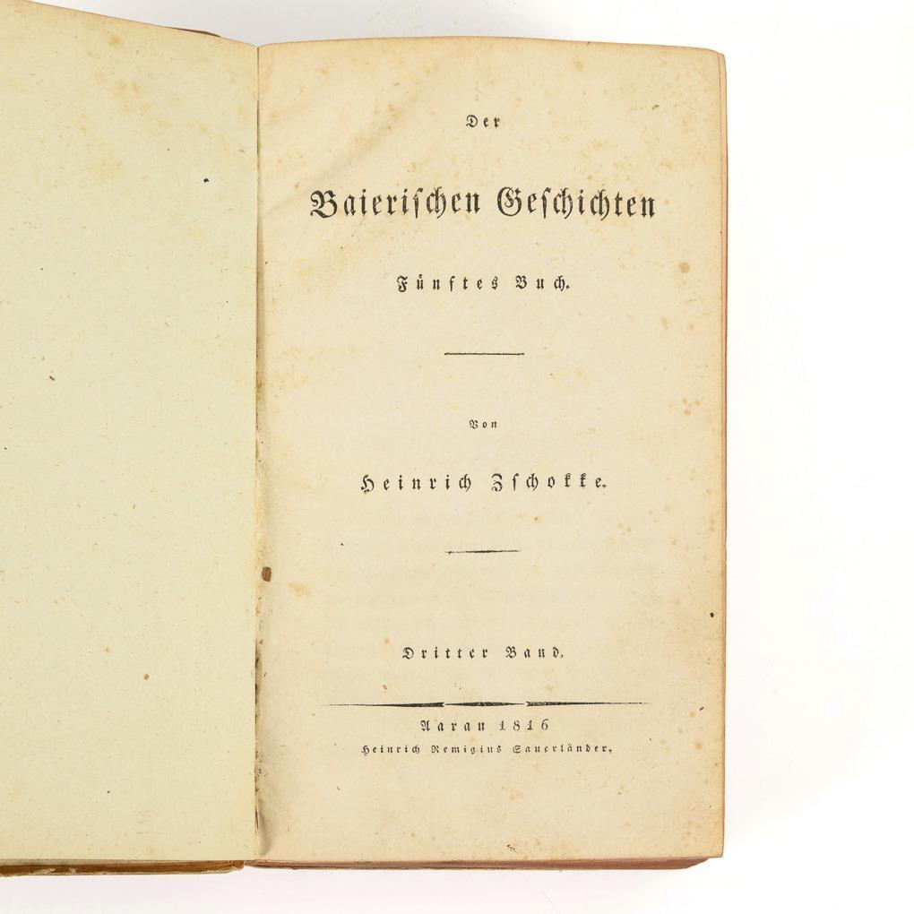 20, 504; 16, 520; 12, 572 pages. Presentation from prehistory to 1726. In brown paperback with red edges. Accompanied by an eight-page text "Karl Heinrich von Lang: "Remarks on Heinrich Zschokke's Bavarian Histories" from 1813. Signs of age and wear, spine somewhat torn, but binding tight.