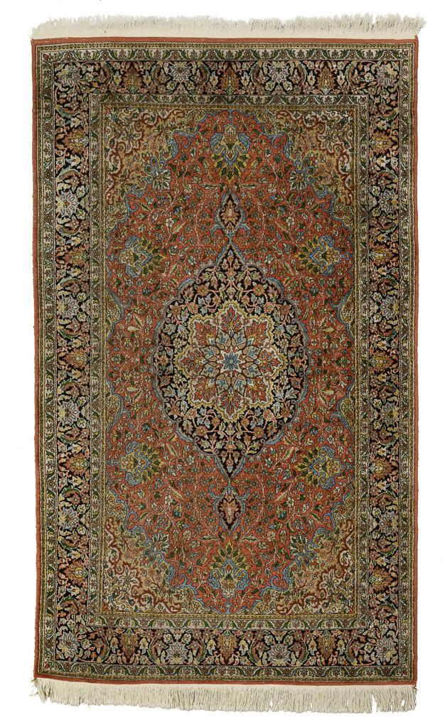 Cotton and silk, polychrome decoration. Approx. 120 x 210 cm.
