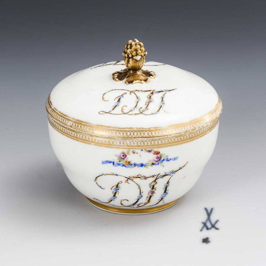 Bellied box with fruit knob lid. On both sides the monogram "DJT" entwined with roses and forget-me-nots. Gold somewhat rubbed.