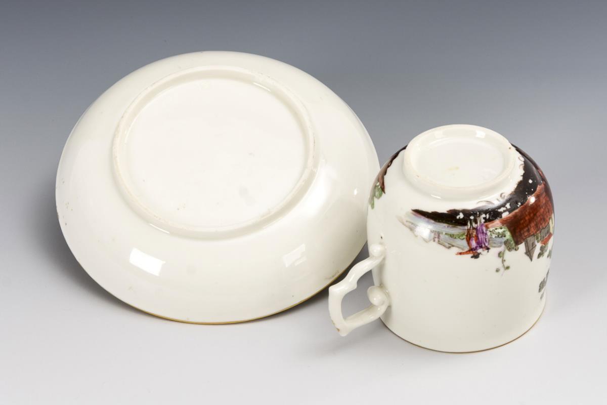 Slightly bulbous cup with angular handle. Depicting a river landscape with architecture and staffage. Paint chipping on the cup.