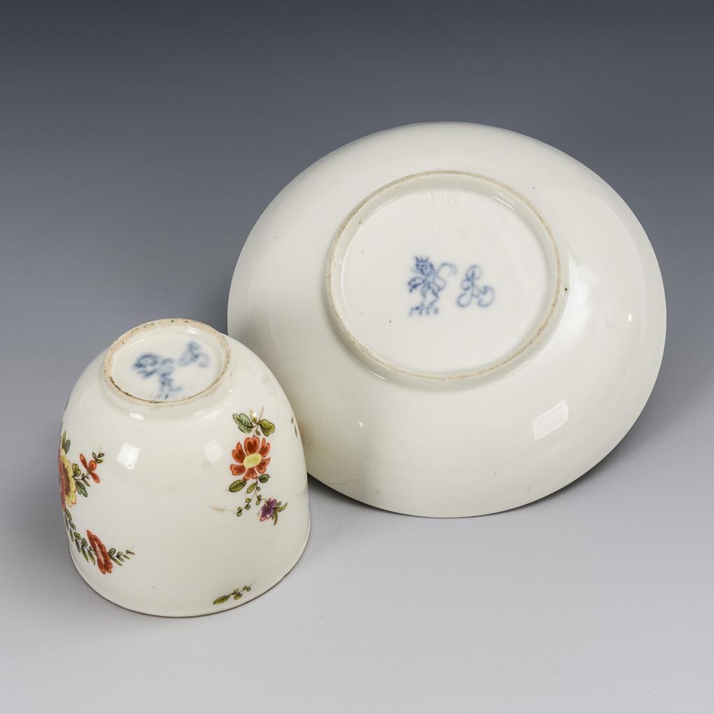 Polychrome painted, gold decorated. H cup 7 cm, Ø original saucer 13 cm.