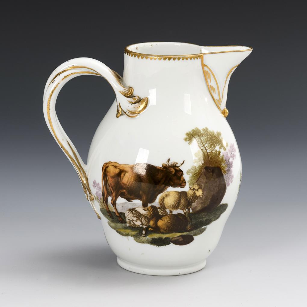 Pear jug with twisted leaf handle. On the wall the representation of a shepherdess with sheep and cow or three sheep with cow. Inside ash approach.