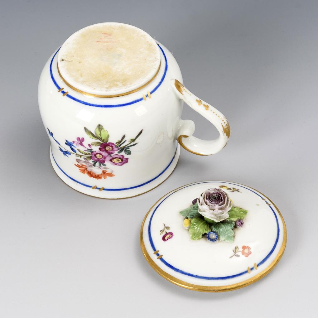 Light baluster form with flower knob lid. On both sides a floral bouquet. Flower knob bumped, minimal gold wear.
